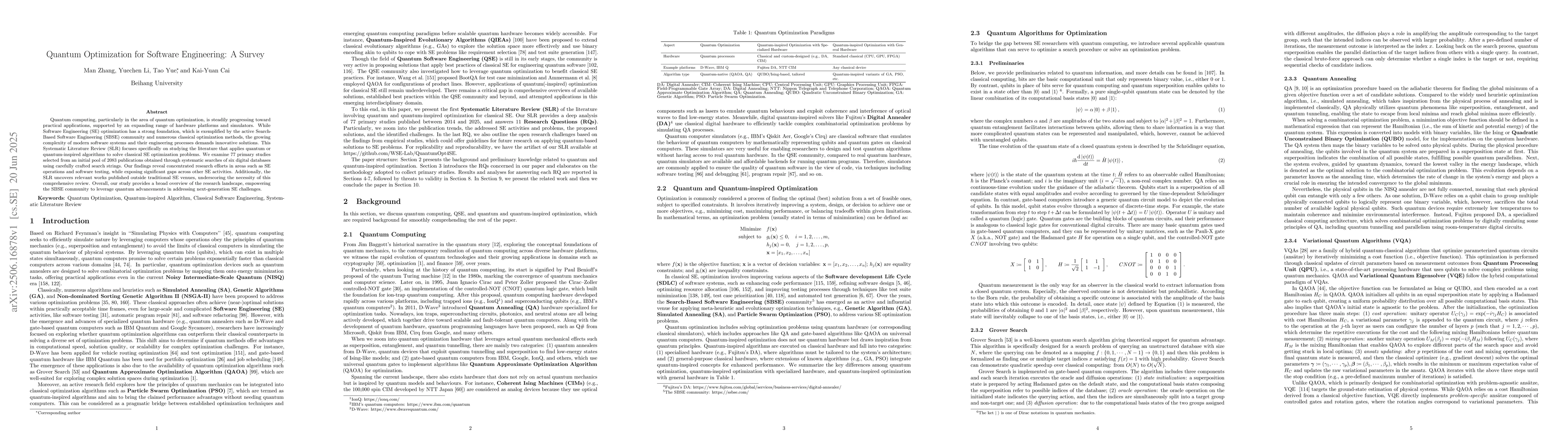 This Systematic Literature Review examines 77 studies applying quantum or quantum-inspired algorithms to software engineering optimization problems. It identifies research concentrations in SE operations and testing, reveals gaps in other SE activities, and highlights the need for a comprehensive review due to relevant works published outside traditional SE venues.