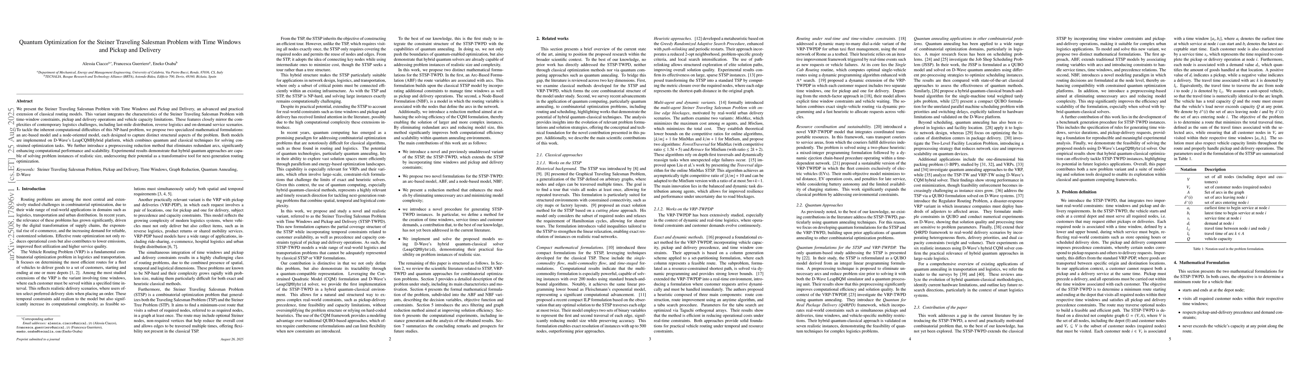 We present the Steiner Traveling Salesman Problem with Time Windows and Pickup and Delivery, an advanced and practical extension of classical routing models. This variant integrates the characteristics of the Steiner Traveling Salesman Problem with time-window constraints, pickup and delivery operations and vehicle capacity limitations. These features closely mirror the complexities of contemporary logistics challenges, including last-mile distribution, reverse logistics and on-demand service scenarios. To tackle the inherent computational difficulties of this NP-hard problem, we propose two specialized mathematical formulations: an arc-based model and a node-oriented model, each designed to capture distinct structural aspects of the problem. Both models are implemented on D-Wave's LeapCQMHybrid platform, which combines quantum and classical techniques for solving constrained optimization tasks. We further introduce a preprocessing reduction method that eliminates redundant arcs, significantly enhancing computational performance and scalability. Experimental results demonstrate that hybrid quantum approaches are capable of solving problem instances of realistic size, underscoring their potential as a transformative tool for next-generation routing optimization.