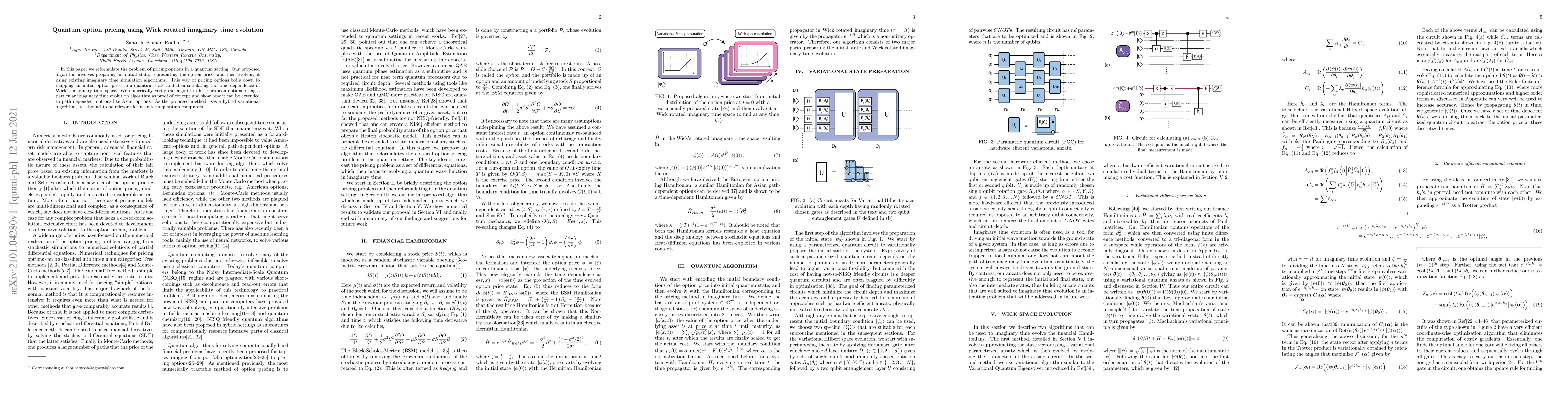 In this paper we reformulate the problem of pricing options in a quantum setting. Our proposed algorithm involves preparing an initial state, representing the option price, and then evolving it using existing imaginary time simulation algorithms. This way of pricing options boils down to mapping an initial option price to a quantum state and then simulating the time dependence in Wick's imaginary time space. We numerically verify our algorithm for European options using a particular imaginary time evolution algorithm as proof of concept and show how it can be extended to path dependent options like Asian options. As the proposed method uses a hybrid variational algorithm, it is bound to be relevant for near-term quantum computers.