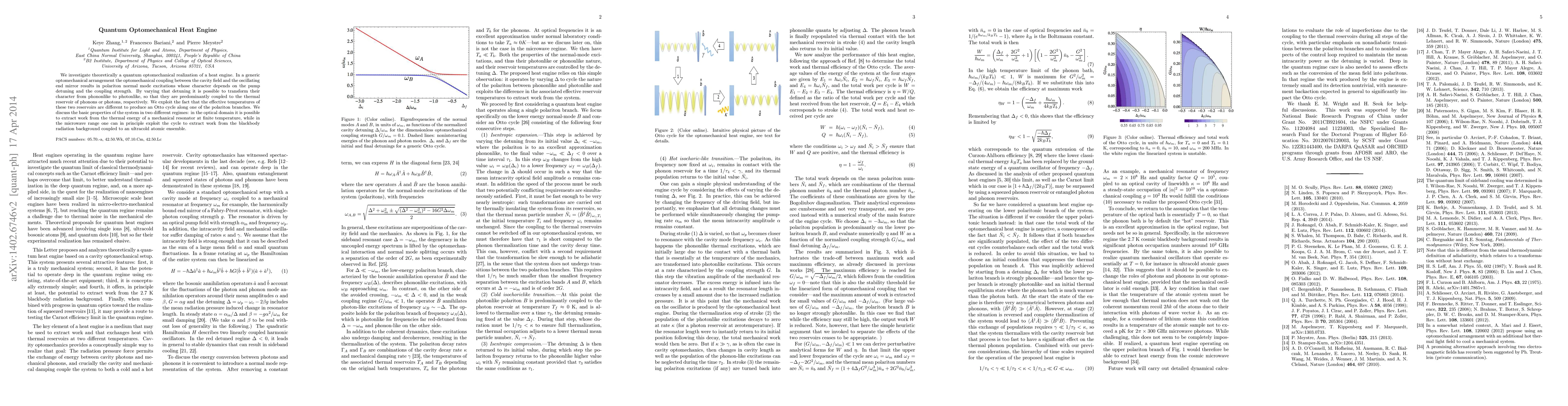 This paper explores a quantum optomechanical heat engine that operates via an Otto cycle, utilizing optomechanical coupling to transform polariton modes between phonon and photon-like states. The system can extract work from thermal energy in optical and microwave domains, respectively.
