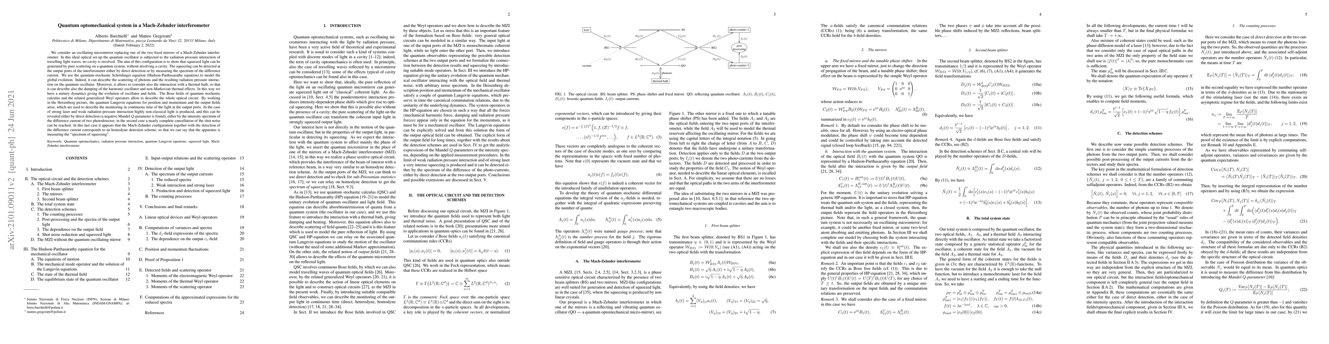 We consider an oscillating micromirror replacing one of the two fixed mirrors of a Mach-Zehnder interferometer. In this ideal optical set-up the quantum oscillator is subjected to the radiation pressure interaction of travelling light waves, no cavity is involved. This configuration shows that squeezed light can be generated by pure scattering on a quantum system, without involving a cavity. The squeezing can be detected at the output ports of the interferometer either by direct detection or by measuring the spectrum of the difference current. We use the Hudson-Parthasarathy equation to model the global evolution. It can describe the scattering of photons and the resulting radiation pressure interaction on the quantum oscillator. It allows to consider also the interaction with a thermal bath. In this way we have a unitary dynamics giving the evolution of oscillator and fields. The Bose fields of quantum stochastic calculus and the related generalized Weyl operators allow to describe the whole optical circuit. By working in the Heisenberg picture, the quantum Langevin equations for position and momentum and the output fields arise, which are used to describe the monitoring in continuous time of the light at the output ports. In the case of strong laser and weak radiation pressure interaction highly non-classical light is produced, and this can be revealed either by direct detection (a negative Mandel Q-parameter is found), either by the intensity spectrum of the difference current of two photodetector; in the second case a nearly complete cancellation of the shot noise can be reached. In this last case it appears that the Mach-Zehnder configuration together with the detection of the difference current corresponds to an homodyne detection scheme, so that we can say that the apparatus is measuring the spectrum of squeezing.