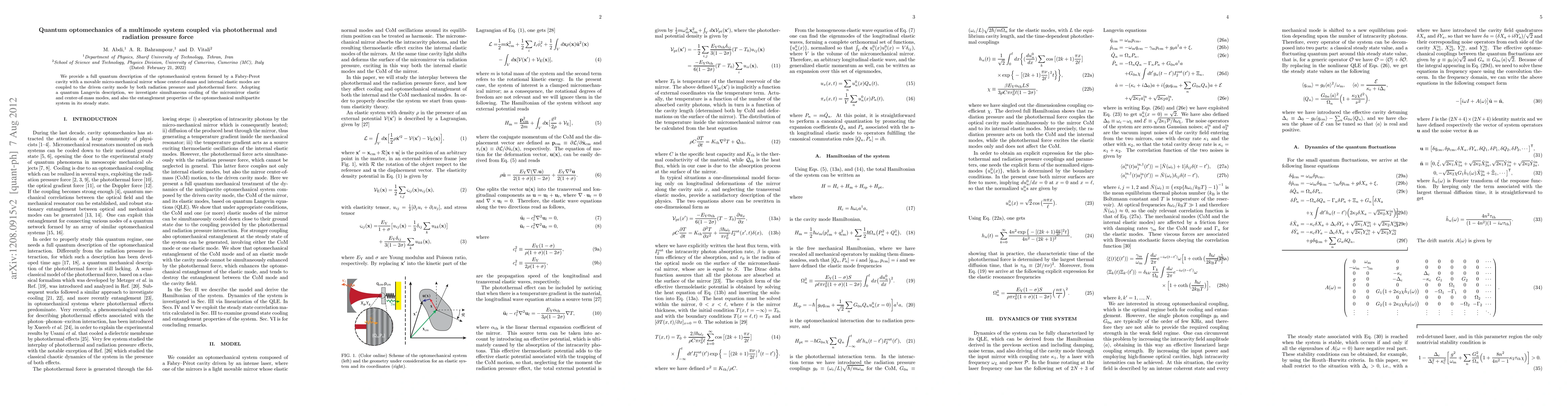 We provide a full quantum description of the optomechanical system formed by a Fabry-Perot cavity with a movable micro-mechanical mirror whose center-of-mass and internal elastic modes are coupled to the driven cavity mode by both radiation pressure and photothermal force. Adopting a quantum Langevin description, we investigate simultaneous cooling of the micromirror elastic and center-of-mass modes, and also the entanglement properties of the optomechanical multipartite system in its steady state.