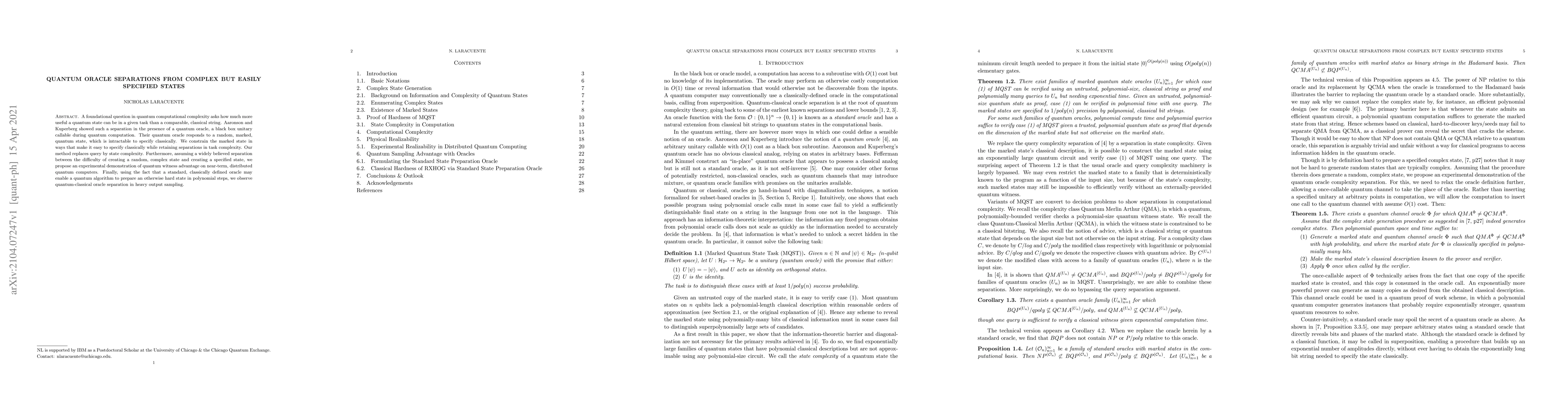 This paper explores quantum oracle separations using complex but easily specified quantum states, demonstrating task complexity advantages over classical strings. It proposes an experimental demonstration of quantum witness advantage on near-term quantum computers, leveraging the distinction between creating random complex states and specified states.