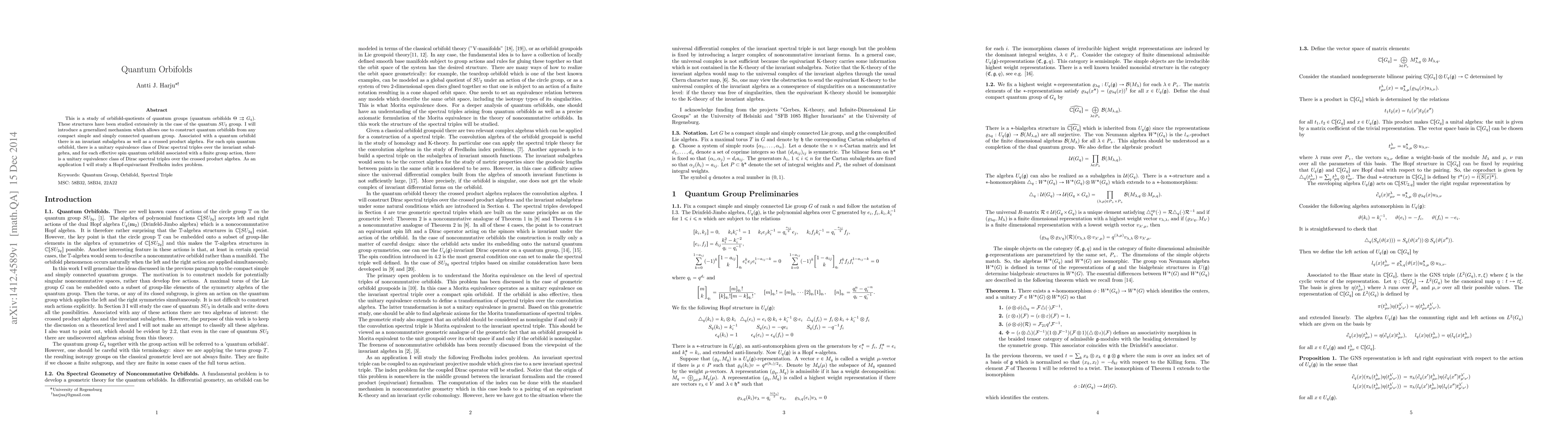 This is a study of orbifold-quotients of quantum groups (quantum orbifolds $\Theta \rightrightarrows G_q$). These structures have been studied extensively in the case of the quantum $SU_2$ group. I will introduce a generalized mechanism which allows one to construct quantum orbifolds from any compact simple and simply connected quantum group. Associated with a quantum orbifold there is an invariant subalgebra as well as a crossed product algebra. For each spin quantum orbifold, there is a unitary equivalence class of Dirac spectral triples over the invariant subalgebra, and for each effective spin quantum orbifold associated with a finite group action, there is a unitary equivalence class of Dirac spectral triples over the crossed product algebra. As an application I will study a Hopf-equivariant Fredholm index problem.