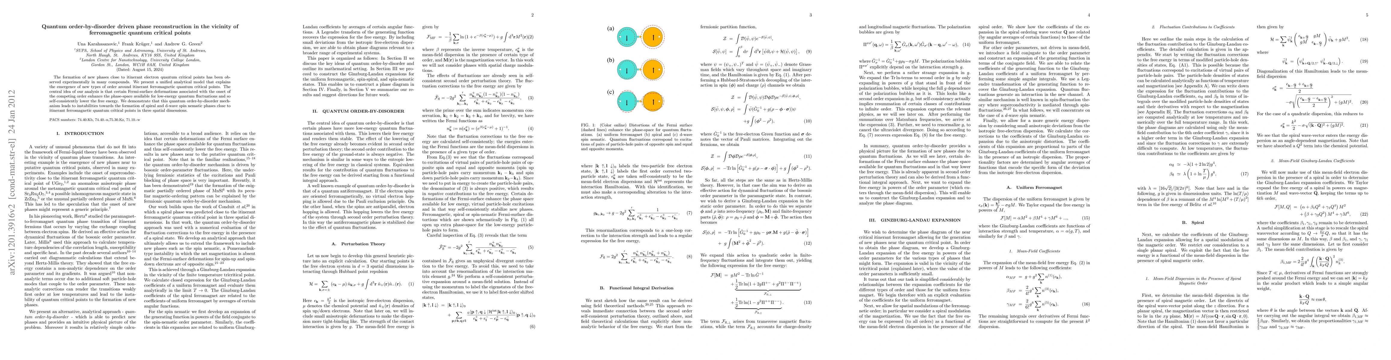 This paper presents a unified analytical model explaining the emergence of new phases near itinerant ferromagnetic quantum critical points, attributing it to a quantum order-by-disorder mechanism that enhances phase-space for quantum fluctuations, leading to instabilities towards spiral and d-wave spin nematic phases.