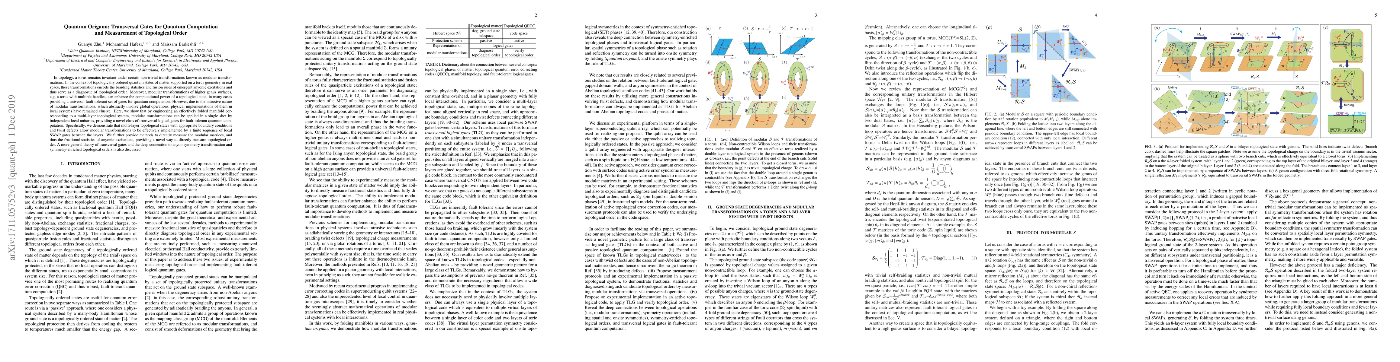 In topology, a torus remains invariant under certain non-trivial transformations known as modular transformations. In the context of topologically ordered quantum states of matter, these transformations encode the braiding statistics and fusion rules of emergent anyonic excitations and thus serve as a diagnostic of topological order. Moreover, modular transformations of higher genus surfaces, e.g. a torus with multiple handles, can enhance the computational power of a topological state, in many cases providing a universal fault-tolerant set of gates for quantum computation. However, due to the intrusive nature of modular transformations, which abstractly involve global operations and manifold surgery, physical implementations of them in local systems have remained elusive. Here, we show that by folding manifolds, modular transformations can be applied in a single shot by independent local unitaries, providing a novel class of transversal logic gates for fault-tolerant quantum computation. Specifically, we demonstrate that multi-layer topological states with appropriate boundary conditions and twist defects allow modular transformations to be effectively implemented by a finite sequence of local SWAP gates between the layers. We further provide methods to directly measure the modular matrices, and thus the fractional statistics of anyonic excitations, providing a novel way to directly measure topological order.