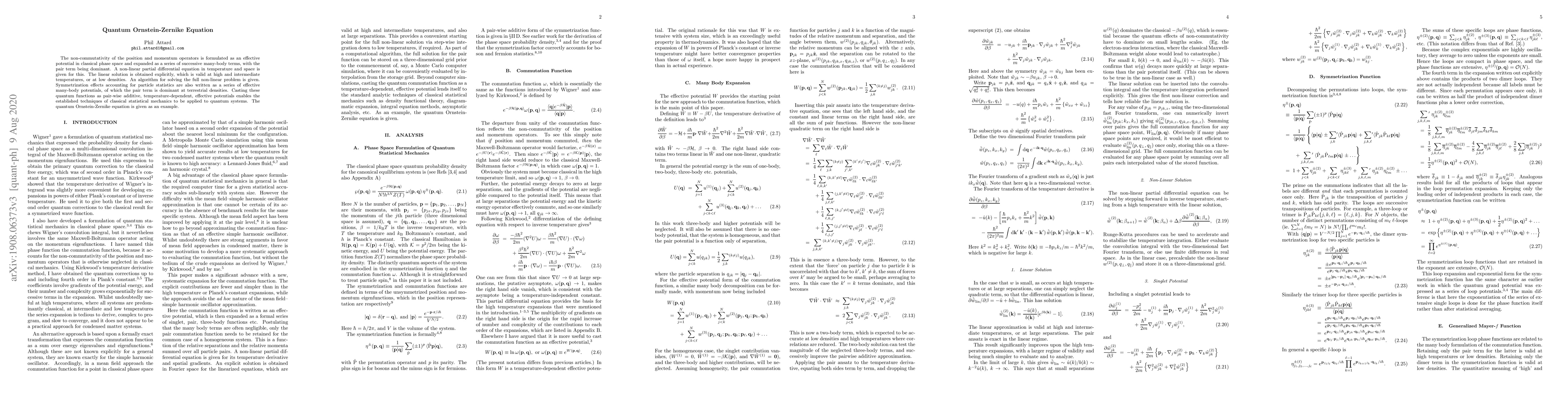 The non-commutativity of the position and momentum operators is formulated as an effective potential in classical phase space and expanded as a series of successive many-body terms, with the pair term being dominant. A non-linear partial differential equation in temperature and space is given for this. The linear solution is obtained explicitly, which is valid at high and intermediate temperatures, or at low densities. An algorithm for solving the full non-linear problem is given. Symmetrization effects accounting for particle statistics are also written as a series of effective many-body potentials, of which the pair term is dominant at terrestrial densities. Casting these quantum functions as pair-wise additive, temperature-dependent, effective potentials enables the established techniques of classical statistical mechanics to be applied to quantum systems. The quantum Ornstein-Zernike equation is given as an example.