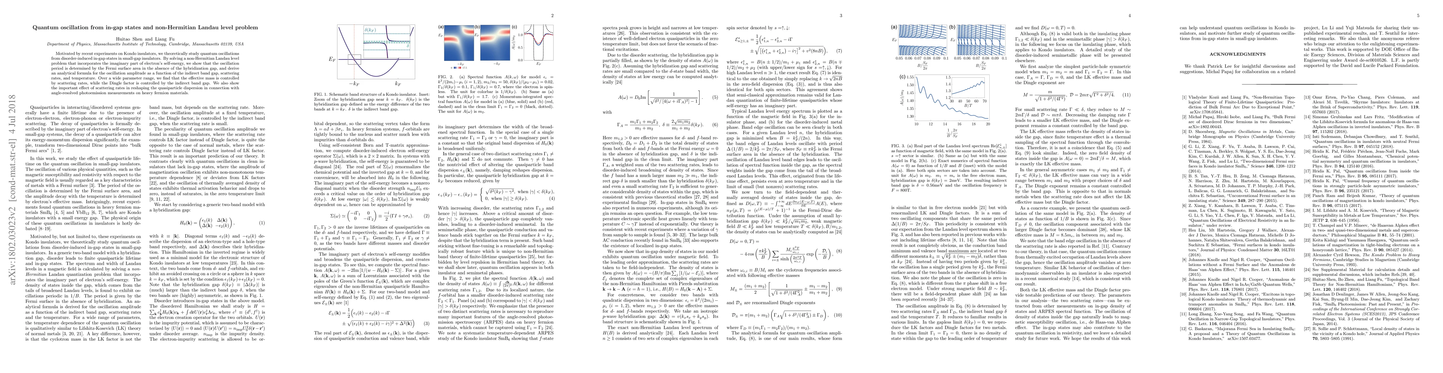 Motivated by recent experiments on Kondo insulators, we theoretically study quantum oscillations from disorder-induced in-gap states in small-gap insulators. By solving a non-Hermitian Landau level problem that incorporates the imaginary part of electron's self-energy, we show that the oscillation period is determined by the Fermi surface area in the absence of the hybridization gap, and derive an analytical formula for the oscillation amplitude as a function of the indirect band gap, scattering rates, and temperature. Over a wide parameter range, we find that the effective mass is controlled by scattering rates, while the Dingle factor is controlled by the indirect band gap. We also show the important effect of scattering rates in reshaping the quasiparticle dispersion in connection with angle-resolved photoemission measurements on heavy fermion materials.