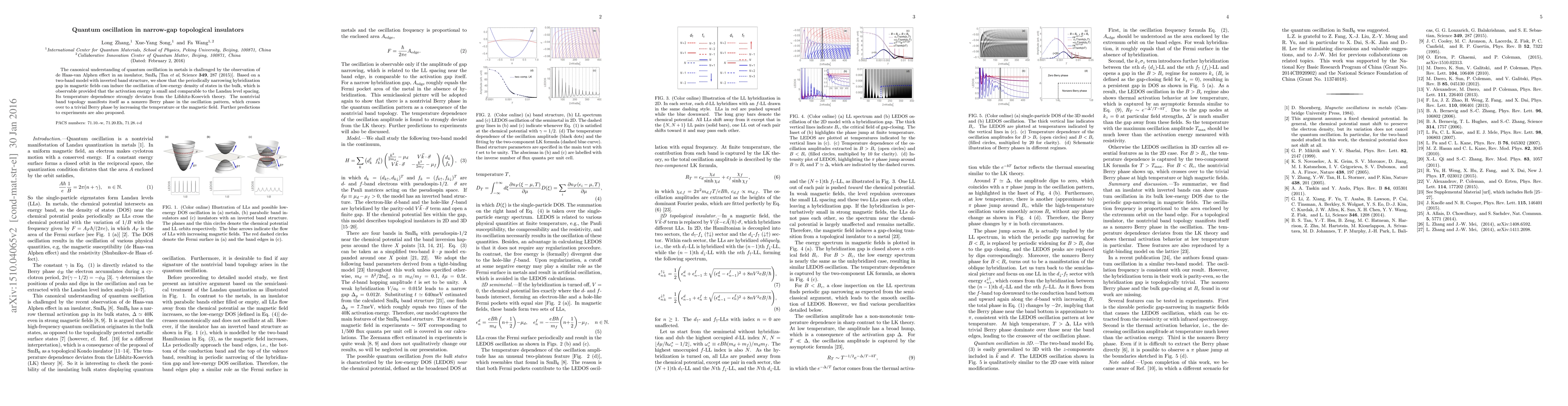 The canonical understanding of quantum oscillation in metals is challenged by the observation of de Haas-van Alphen effect in an insulator, SmB$_{6}$ [Tan \emph{et al}, Science {\bf349}, 287 (2015)]. Based on a two-band model with inverted band structure, we show that the periodically narrowing hybridization gap in magnetic fields can induce the oscillation of low-energy density of states in the bulk, which is observable provided that the hybridization gap is narrow and comparable to the Landau level spacing. Its temperature dependence strongly deviates from the Lifshitz-Kosevich theory. The nontrivial band topology manifests itself as a nonzero Berry phase in the oscillation pattern, which crosses over to a trivial Berry phase by increasing the temperature or the magnetic field. Further predictions to experiments are also proposed.
