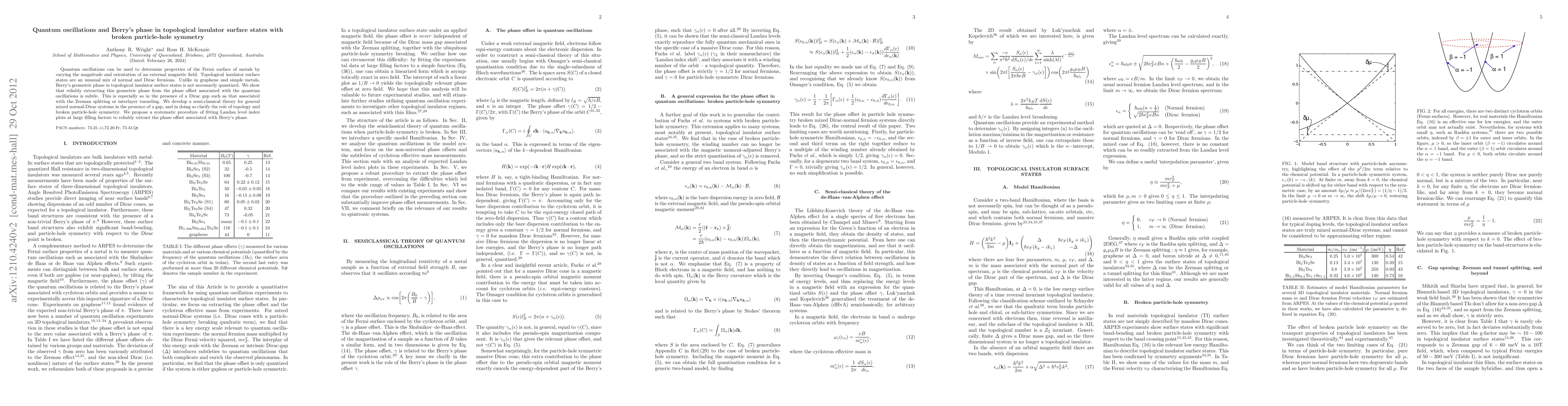 This paper investigates quantum oscillations in topological insulator surface states with broken particle-hole symmetry, highlighting the complexity of extracting Berry's geometric phase due to the presence of a Dirac gap. The authors propose a fitting method to reliably determine the phase offset, clarifying the impact of topology and symmetry breaking.