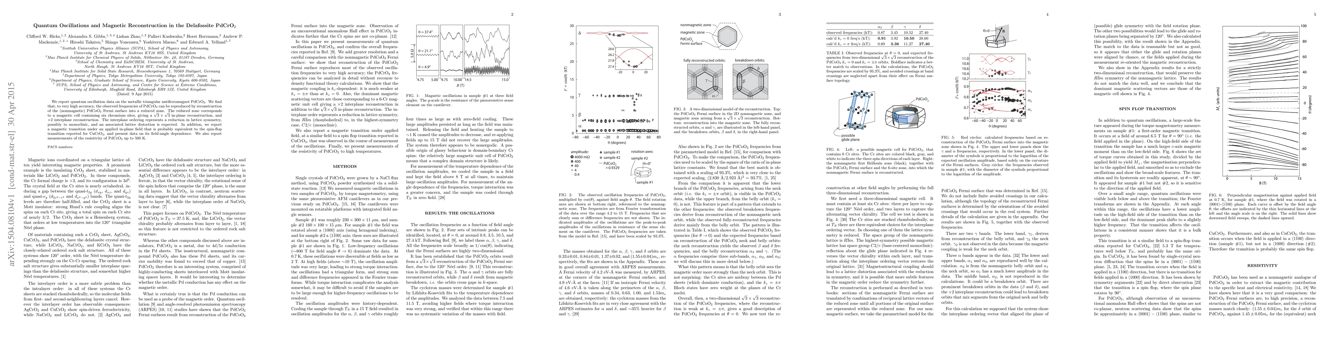 This paper reports quantum oscillation data revealing that PdCrO$_2$ undergoes a magnetic reconstruction transforming its Fermi surface, leading to a $\sqrt{3} \times \sqrt{3}$ in-plane and $\times 2$ interplane reconstruction, likely reducing lattice symmetry. Additionally, it describes a magnetic transition in an applied field and resistivity measurements up to 500 K.