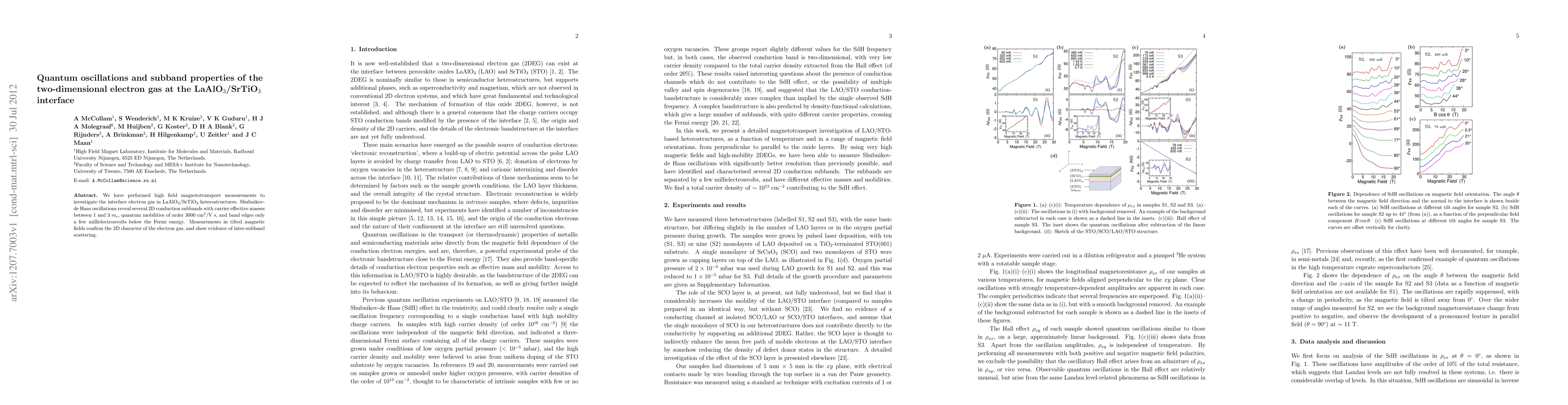 We have performed high field magnetotransport measurements to investigate the interface electron gas in LaAlO3/SrTiO3 heterostructures. Shubnikov-de Haas oscillations reveal several 2D conduction subbands with carrier effective masses between 1 and 3 m_e, quantum mobilities of order 3000 cm^2/V s, and band edges only a few millielectronvolts below the Fermi energy. Measurements in tilted magnetic fields confirm the 2D character of the electron gas, and show evidence of inter-subband scattering.