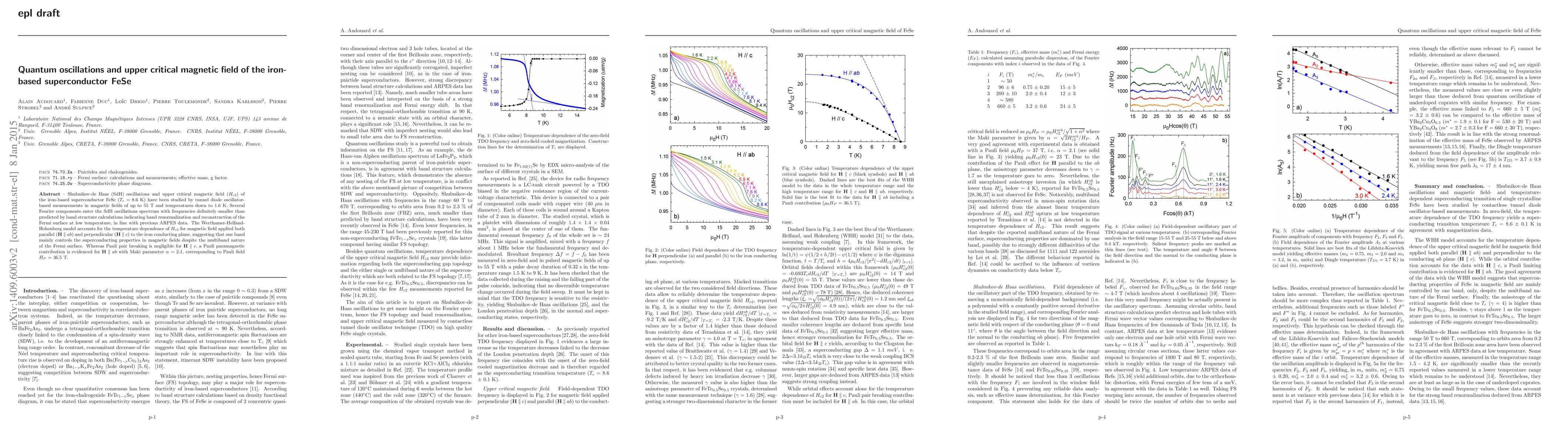 This study investigates the quantum oscillations and upper critical magnetic field ($H_{c2}$) of FeSe, an iron-based superconductor, using tunnel diode oscillator-based measurements. It reveals multiple Fourier components in Shubnikov-de Haas oscillations, suggesting Fermi surface reconstruction, and finds that the Wertheimer-Helfand-Hohenberg model fits the $H_{c2}$ temperature dependence, indicating a dominant band despite a multiband Fermi surface.