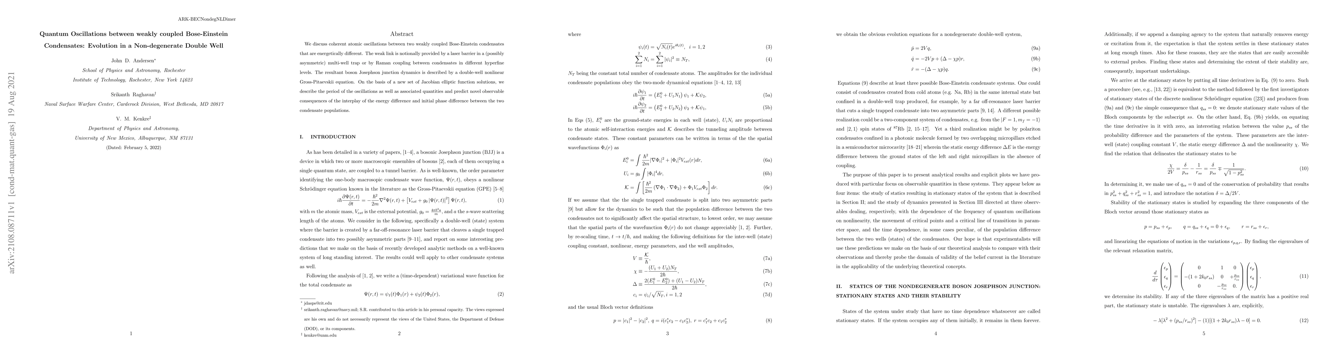 This paper investigates coherent oscillations between two weakly coupled Bose-Einstein condensates in a non-degenerate double well, using a laser barrier or Raman coupling as the weak link. The dynamics are modeled by a nonlinear Gross-Pitaevskii equation, revealing novel observable consequences based on the energy difference and initial phase difference between the condensates.
