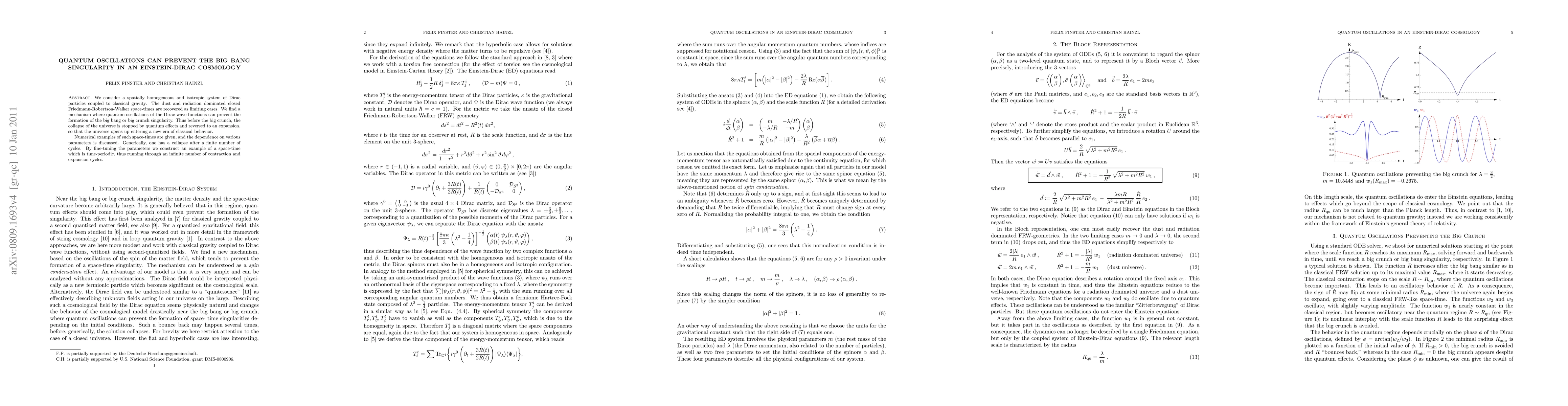 We consider a spatially homogeneous and isotropic system of Dirac particles coupled to classical gravity. The dust and radiation dominated closed Friedmann-Robertson-Walker space-times are recovered as limiting cases. We find a mechanism where quantum oscillations of the Dirac wave functions can prevent the formation of the big bang or big crunch singularity. Thus before the big crunch, the collapse of the universe is stopped by quantum effects and reversed to an expansion, so that the universe opens up entering a new era of classical behavior. Numerical examples of such space-times are given, and the dependence on various parameters is discussed. Generically, one has a collapse after a finite number of cycles. By fine-tuning the parameters we construct an example of a space-time which is time-periodic, thus running through an infinite number of contraction and expansion cycles.