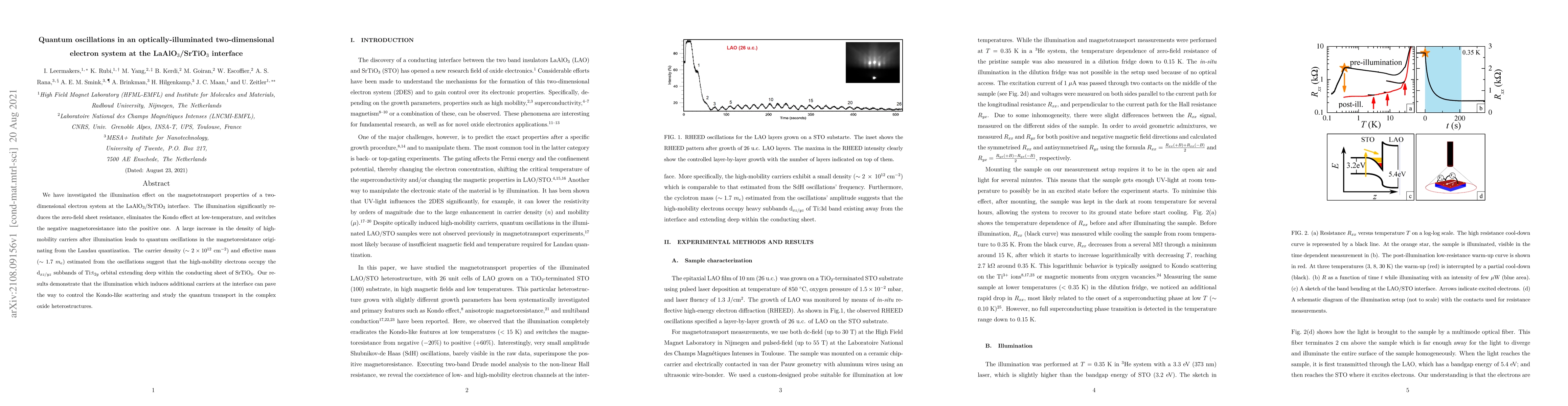 This paper explores how optical illumination affects the magnetotransport properties of a two-dimensional electron system at the LaAlO$_3$/SrTiO$_3$ interface, revealing significant changes in resistance and the emergence of quantum oscillations due to increased carrier density and effective mass. The findings suggest that illumination can control Kondo-like scattering and quantum transport in complex oxide heterostructures.
