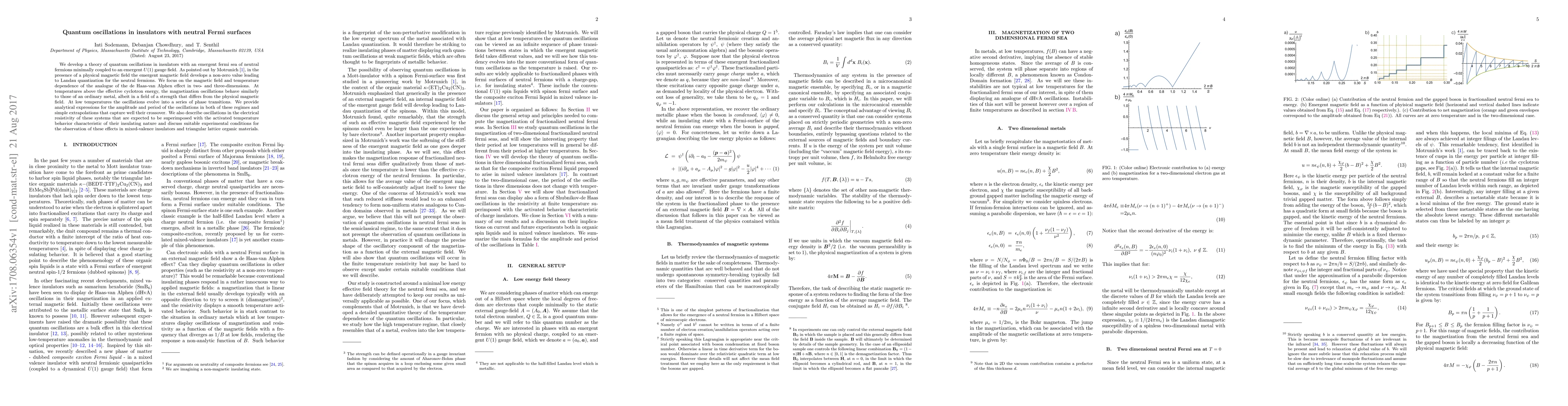 The paper presents a theory for quantum oscillations in insulators with neutral fermions and an emergent gauge field, detailing their magnetic field and temperature dependence. It provides analytical expressions for oscillation amplitude and period, and discusses experimental conditions for observing these effects in mixed-valence insulators and organic materials on triangular lattices.