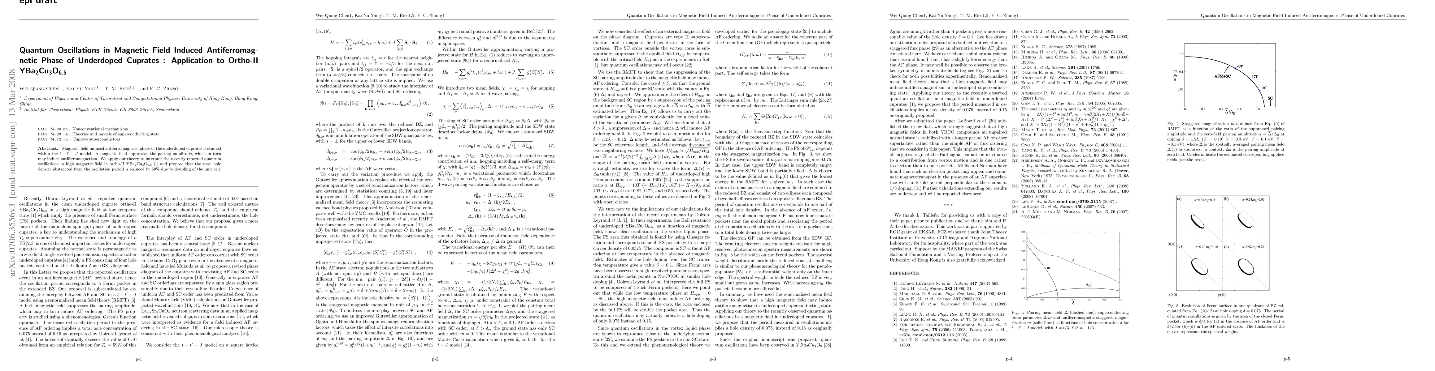 This paper explores the magnetic field-induced antiferromagnetic phase in underdoped cuprates using the t-t'-J model, suggesting that field suppression of pairing leads to antiferromagnetism. The study applies this theory to explain quantum oscillations in ortho-II YBa2Cu3O6.5, proposing a 50% reduction in total hole density due to the induced antiferromagnetism.