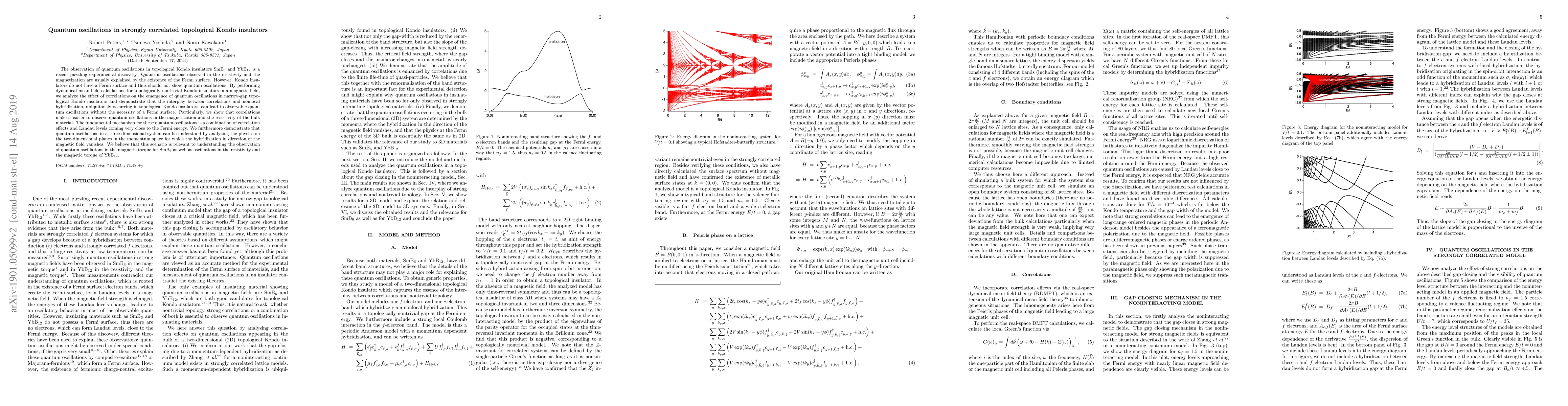 This paper investigates quantum oscillations in topological Kondo insulators like SmB6 and YbB12, which traditionally lack a Fermi surface. The study reveals that strong correlations and nonlocal hybridization can generate observable quantum oscillations, challenging conventional explanations and suggesting a new mechanism involving correlation effects and Landau levels near the Fermi energy.