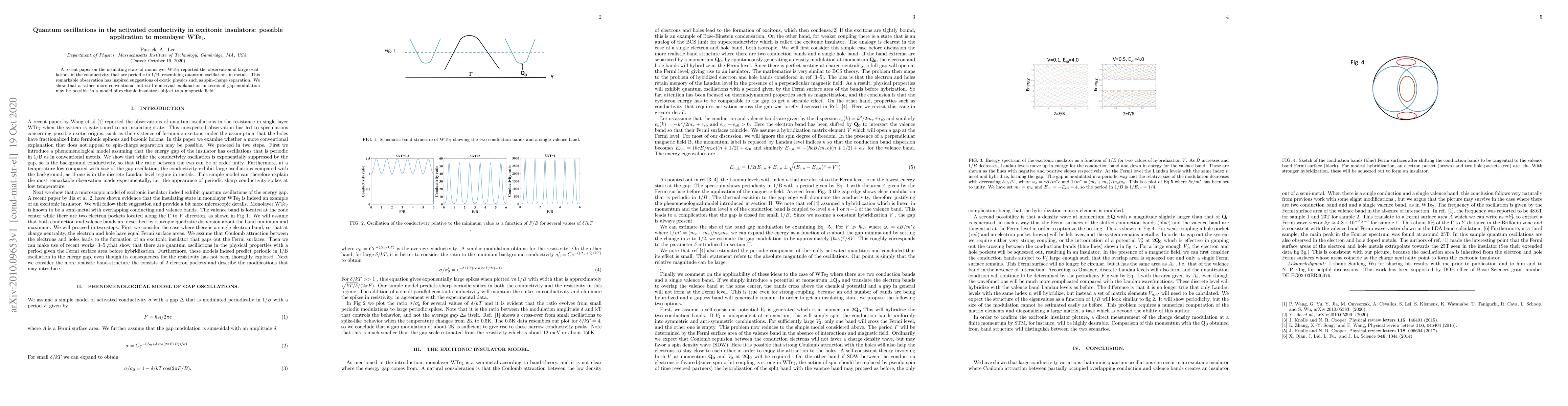 A recent paper on the insulating state of monolayer WTe2 reported the observation of large oscillations in the conductivity that are periodic in 1/B, resembling quantum oscillations in metals. This remarkable observation has inspired suggestions of exotic physics such as spin-charge separation. We show that a rather more conventional but still nontrivial explanation in terms of gap modulation may be possible in a model of excitonic insulator subject to a magnetic field.