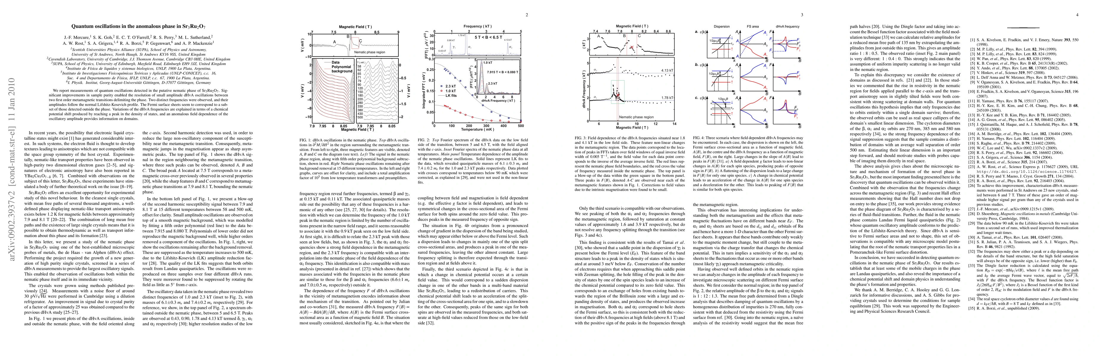 We report measurements of quantum oscillations detected in the putative nematic phase of Sr3Ru2O7. Significant improvements in sample purity enabled the resolution of small amplitude dHvA oscillations between two first order metamagnetic transitions delimiting the phase. Two distinct frequencies were observed, and their amplitudes follow the normal Lifshitz-Kosevich profile. The Fermi surface sheets seem to correspond to a subset of those detected outside the phase. Variations of the dHvA frequencies are explained in terms of a chemical potential shift produced by reaching a peak in the density of states, and an anomalous field dependence of the oscillatory amplitude provides information on domains.