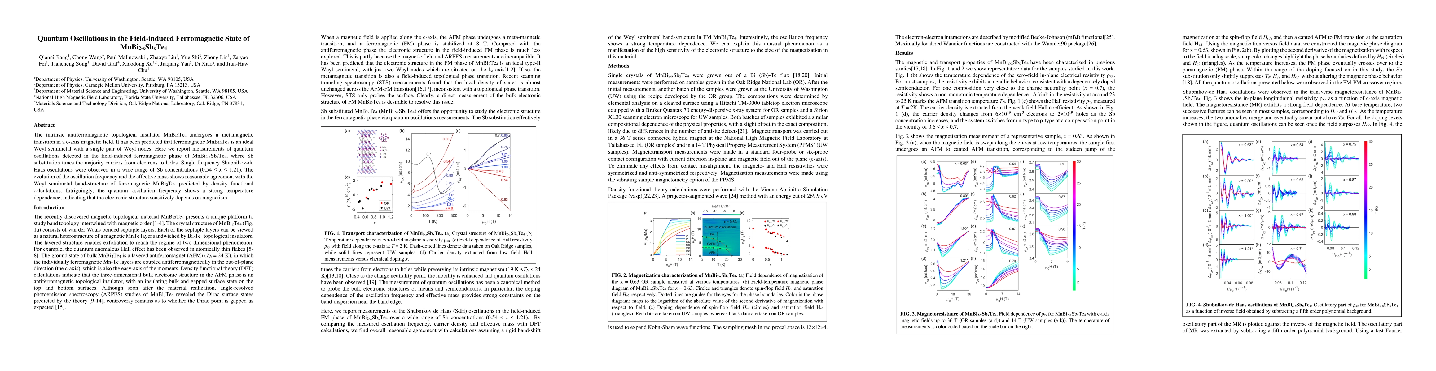 Researchers observed quantum oscillations in MnBi$_{2-x}$Sb$_{x}$Te$_{4}$, a ferromagnetic topological insulator, showing agreement with predicted Weyl semimetal band-structure. The oscillation frequency shows strong temperature dependence, indicating sensitive electronic structure.