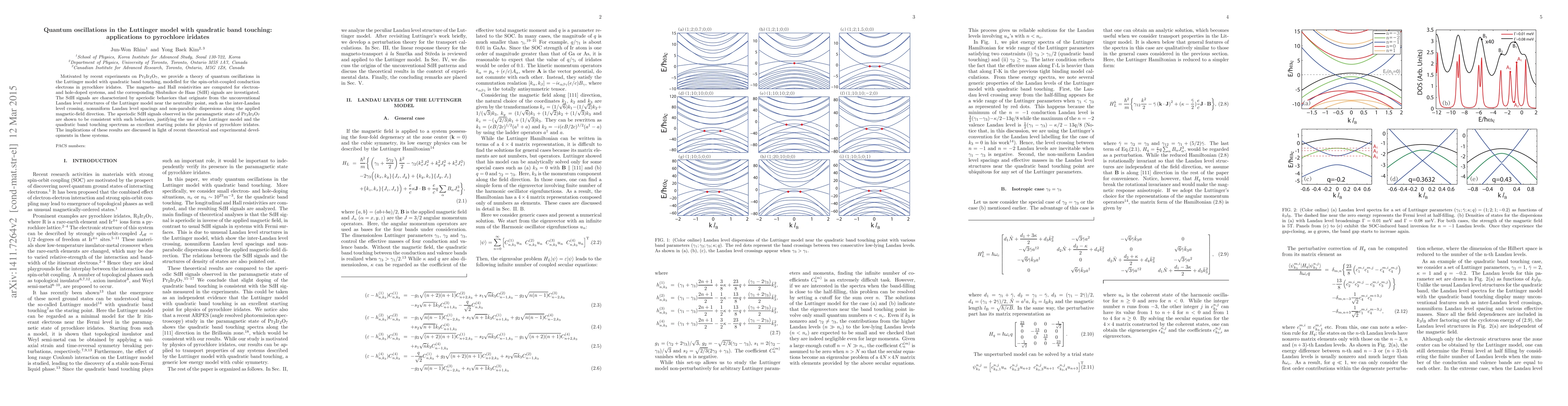 This paper develops a theoretical framework for quantum oscillations in the Luttinger model with quadratic band touching, specifically applied to pyrochlore iridates like Pr2Ir2O7. It computes magneto- and Hall resistivities and investigates Shubnikov de Haas signals, revealing aperiodic behaviors due to unconventional Landau levels, which align with experimental observations in Pr2Ir2O7, supporting the Luttinger model for these materials.