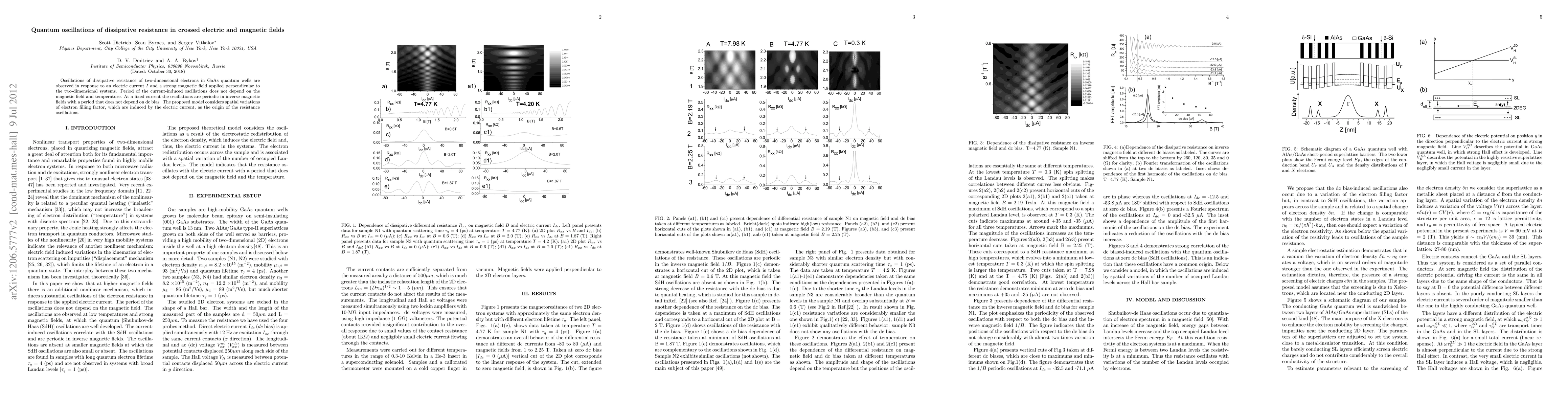 This study observes periodic oscillations in the dissipative resistance of two-dimensional electrons in GaAs quantum wells under crossed electric and magnetic fields. The oscillations' period remains invariant to magnetic field and temperature variations, suggesting a model where spatial electron filling factor variations driven by electric current are the root cause.
