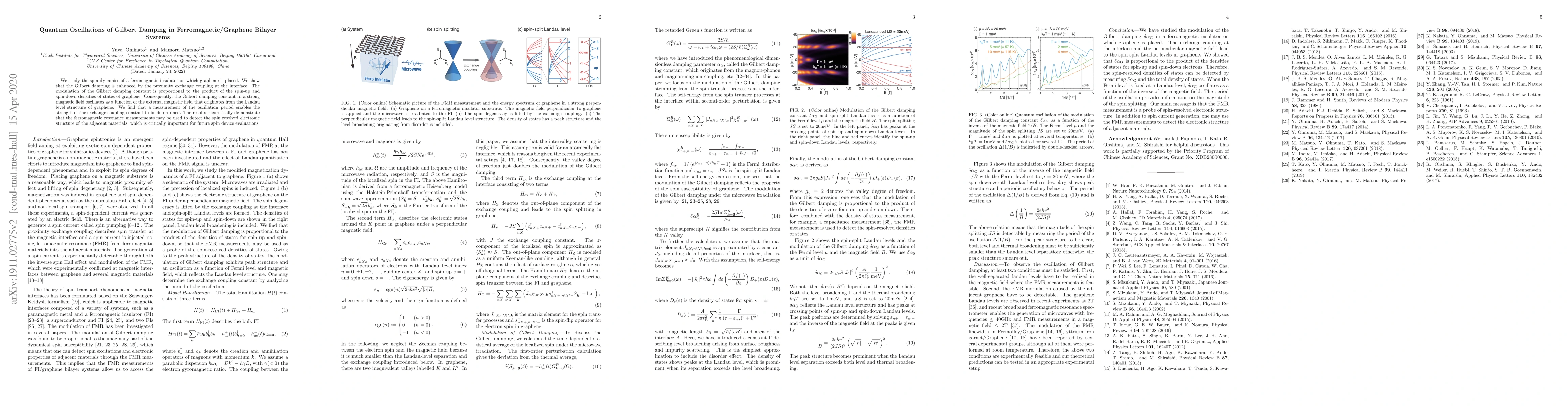 This study investigates the enhanced Gilbert damping in ferromagnetic/graphene bilayer systems due to proximity exchange coupling, revealing oscillations in the damping constant linked to graphene's Landau levels. The oscillation period measurement can determine the strength of the exchange coupling, highlighting the potential for using ferromagnetic resonance to assess the spin-resolved electronic structure of adjacent materials.