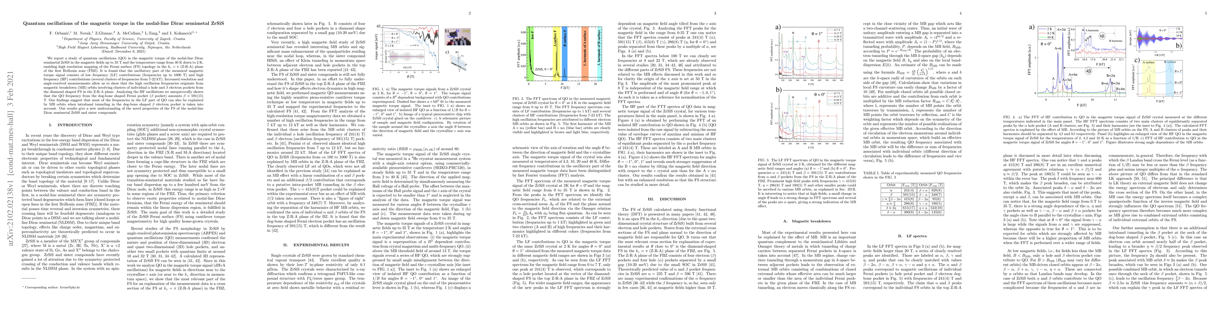 This study investigates quantum oscillations in the magnetic torque of ZrSiS, a nodal-line Dirac semimetal, revealing complex Fermi surface topology. High-frequency oscillations correlate with magnetic breakdown orbits, particularly identifying a significant oscillation frequency of $\beta=591(15)$ T from the $\beta$ electron pocket, while lower frequencies suggest intraband tunneling effects.