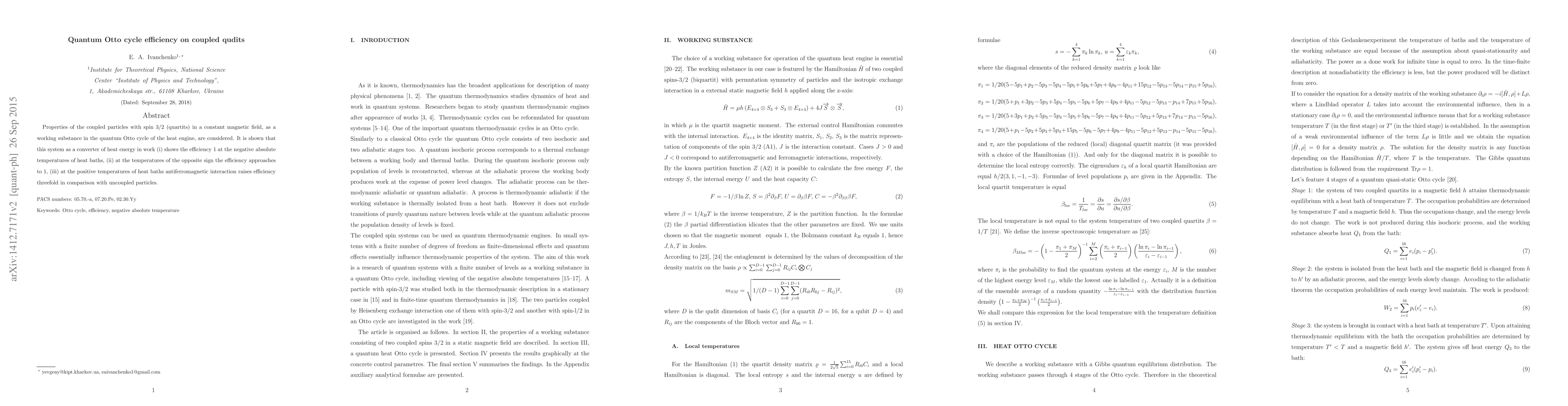 Properties of the coupled particles with spin 3/2 (quartits) in a constant magnetic field, as a working substance in the quantum Otto cycle of the heat engine, are considered. It is shown that this system as a converter of heat energy in work (i) shows the efficiency 1 at the negative absolute temperatures of heat baths, (ii) at the temperatures of the opposite sign the efficiency approaches to 1, (iii) at the positive temperatures of heat baths antiferromagnetic interaction raises efficiency threefold in comparison with uncoupled particles.