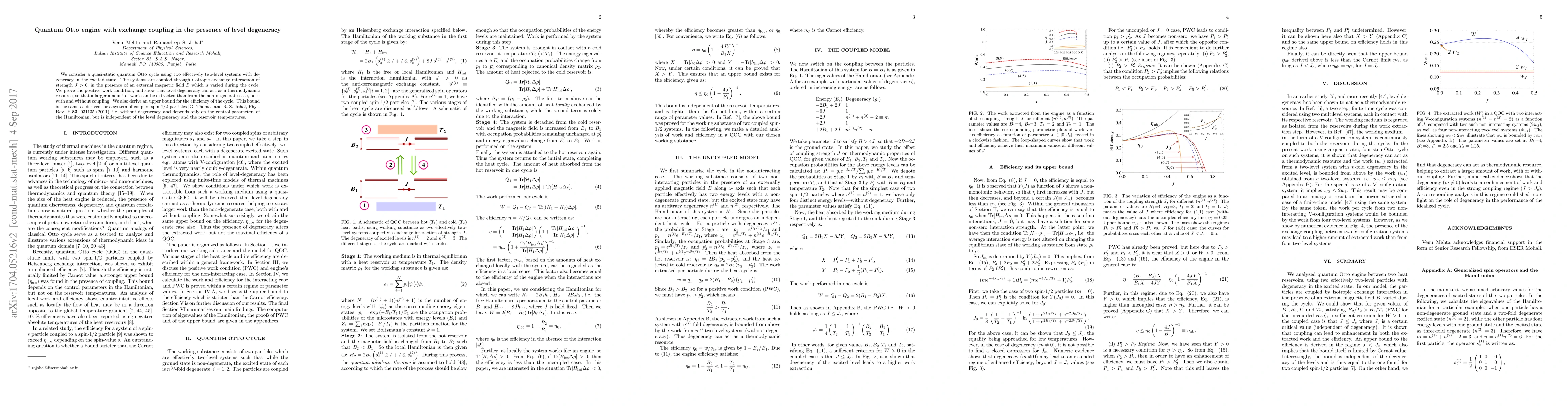 We consider a quasi-static quantum Otto cycle using two effectively two-level systems with degeneracy in the excited state. The systems are coupled through isotropic exchange interaction of strength $J>0$, in the presence of an external magnetic field $B$ which is varied during the cycle. We prove the positive work condition, and show that level-degeneracy can act as a thermodynamic resource, so that a larger amount of work can be extracted than from the non-degenerate case, both with and without coupling. We also derive an upper bound for the efficiency of the cycle. This bound is the same as derived for a system of coupled spin-1/2 particles [G. Thomas and R. S. Johal, Phys. Rev. E {\bf 83}, 031135 (2011)] i.e. without degeneracy, and depends only on the control parameters of the Hamiltonian, but is independent of the level degeneracy and the reservoir temperatures.