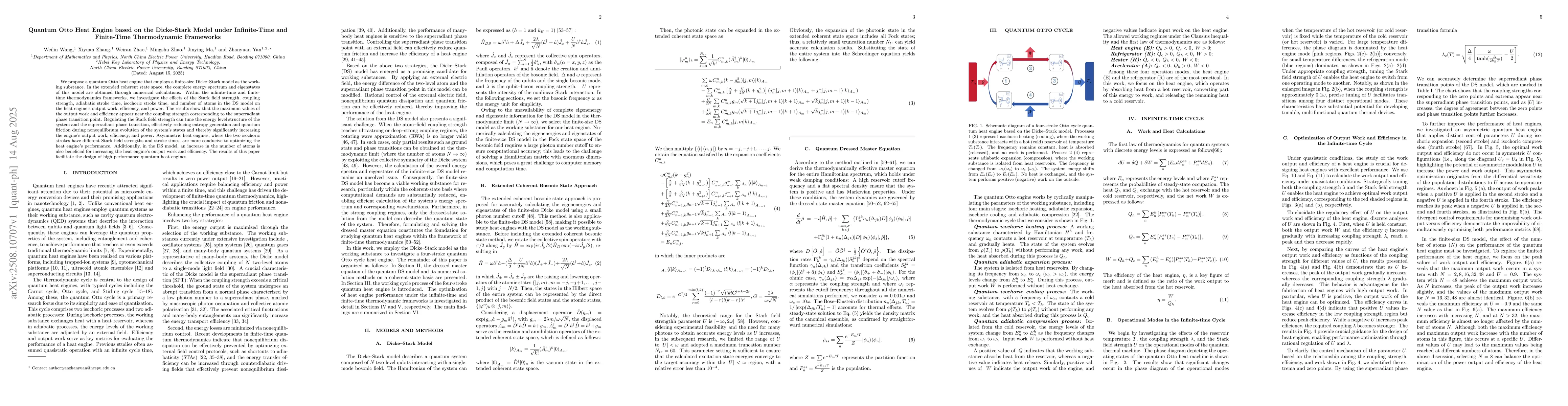 We propose a quantum Otto heat engine that employs a finite-size Dicke-Stark model as the working substance. In the extended coherent state space, the complete energy spectrum and eigenstates of this model are obtained through numerical calculations. Within the infinite-time and finite-time thermodynamics frameworks, we investigate the effects of the Stark field strength, coupling strength, adiabatic stroke time, isochoric stroke time, and number of atoms in the DS model on the heat engine's output work, efficiency, and power. The results show that the maximum values of the output work and efficiency appear near the coupling strength corresponding to the superradiant phase transition point. Regulating the Stark field strength can tune the energy level structure of the system and the superradiant phase transition, effectively reducing entropy generation and quantum friction during nonequilibrium evolution of the system's states and thereby significantly increasing the engine's output work, efficiency, and power. Asymmetric heat engines, where the two isochoric strokes have different Stark field strengths and stroke times, are more conducive to optimizing the heat engine's performance. Additionally, in the DS model, an increase in the number of atoms is also beneficial for increasing the heat engine's output work and efficiency. The results of this paper facilitate the design of high-performance quantum heat engines.