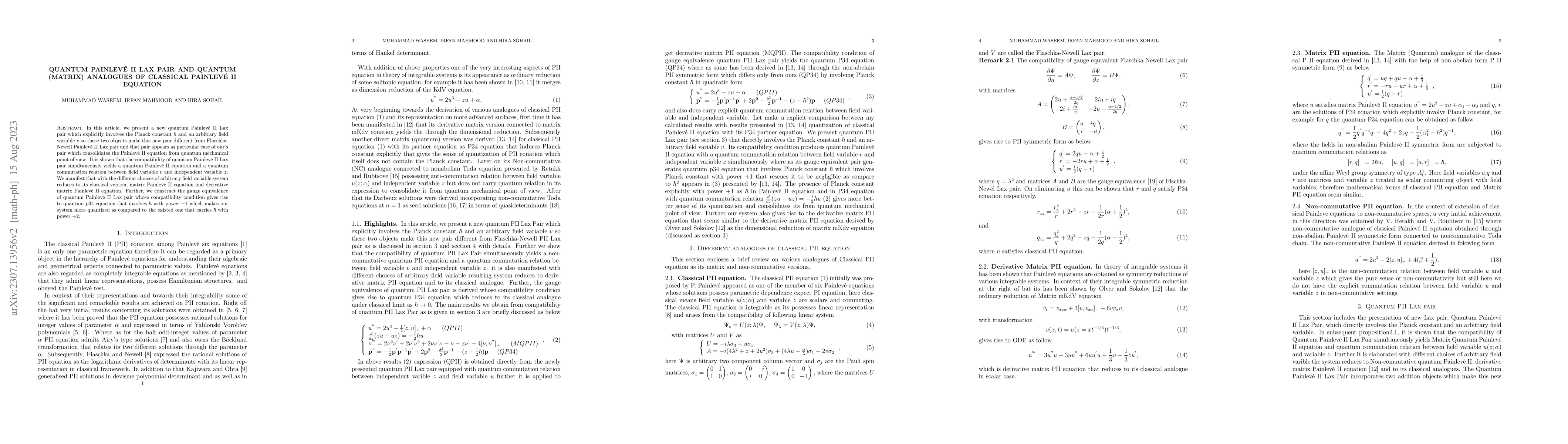 In this article, we present a new quantum Painlev\'e II Lax pair which explicitly involves the Planck constant $ \hbar $ and an arbitrary field variable $v$ so these two objects make this new pair different from Flaschka-Newell Painlev\'e II Lax pair and that pair appears as particular case of our's pair which consolidates the Painlev\'e II equation from quantum mechanical point of view. It is shown that the compatibility of quantum Painlev\'e II Lax pair simultaneously yields a quantum Painlev\'e II equation and a quantum commutation relation between field variable $v $ and independent variable $z$. We manifest that with the different choices of arbitrary field variable system reduces to its classical version, matrix Painlev\'e II equation and derivative matrix Painlev\'e II equation. Further, we construct the gauge equivalence of quantum Painlev\'e II Lax pair whose compatibility condition gives rise to quantum p34 equation that involves $\hbar $ with power $+1$ which makes our system more quantized as compared to the existed one that carries $\hbar $ with power $+2$.