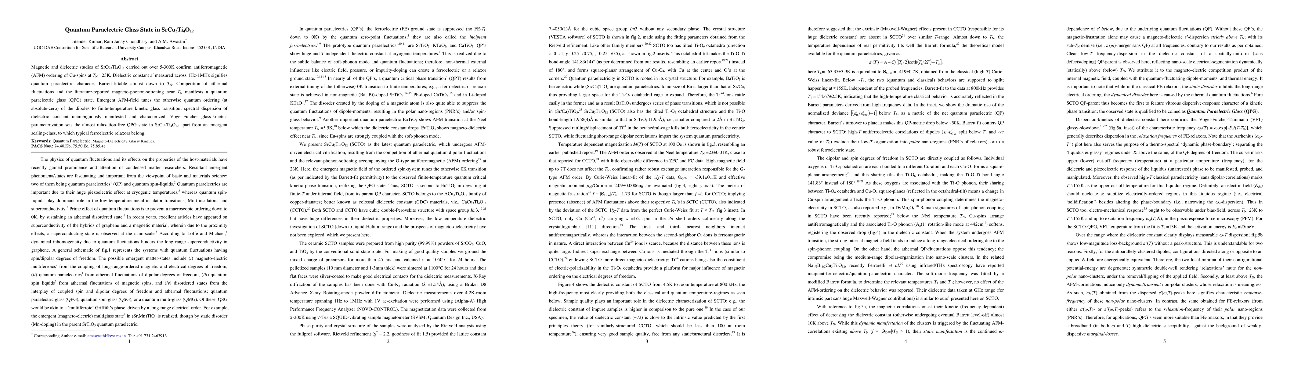 Magnetic and dielectric studies of SrCu3Ti4O12 carried out over 5-300K confirm antiferromagnetic (AFM) ordering of Cu-spins at TN =23K. Dielectric constant {\epsilon}' measured across 1Hz-1MHz signifies quantum paraelectric character, Barrett-fittable almost down to TN. Competition of athermal fluctuations and the literature-reported magneto-phonon-softening near TN manifests a maiden quantum paraelectric glass (QPG) state. Emergent AFM-field tunes the otherwise quantum ordering (at absolute-zero) of the dipoles to finite-temperature kinetic glass transition; spectral dispersion of dielectric constant unambiguously manifested and characterized. Vogel-Fulcher glass-kinetics parameterization sets the almost relaxation-free QPG state in SrCu3Ti4O12 apart from an emergent scaling-class, to which typical ferroelectric relaxors belong.