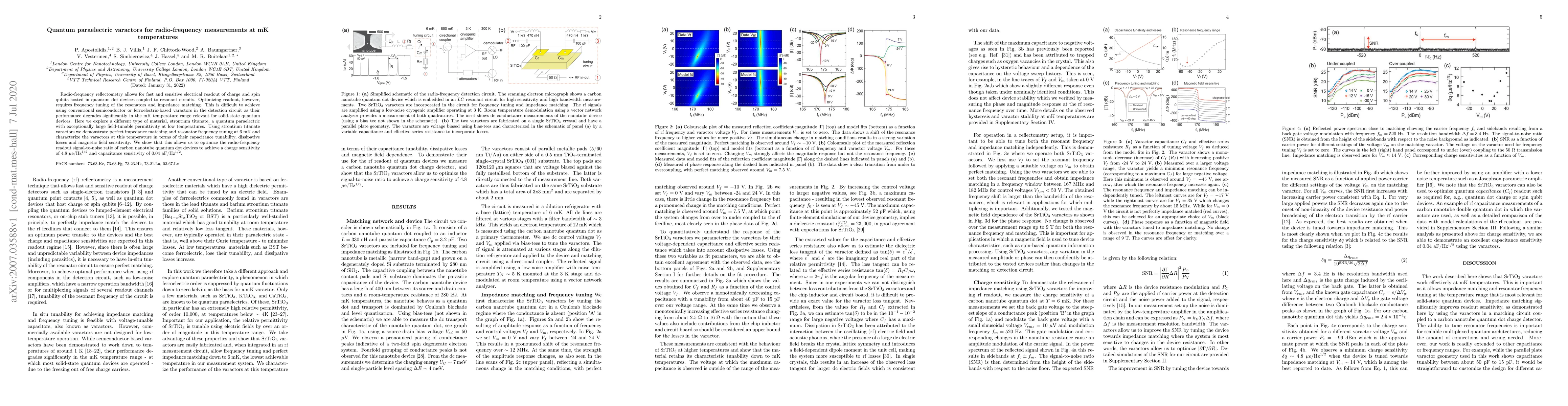 This paper explores quantum paraelectric strontium titanate varactors for radio-frequency measurements at millikelvin temperatures, demonstrating improved frequency tuning and impedance matching compared to conventional varactors. The study shows optimized readout signal-to-noise ratio for quantum dot devices, achieving charge sensitivity of 4.8 μe/Hz¹/₂ and capacitance sensitivity of 0.04 aF/Hz¹/₂.