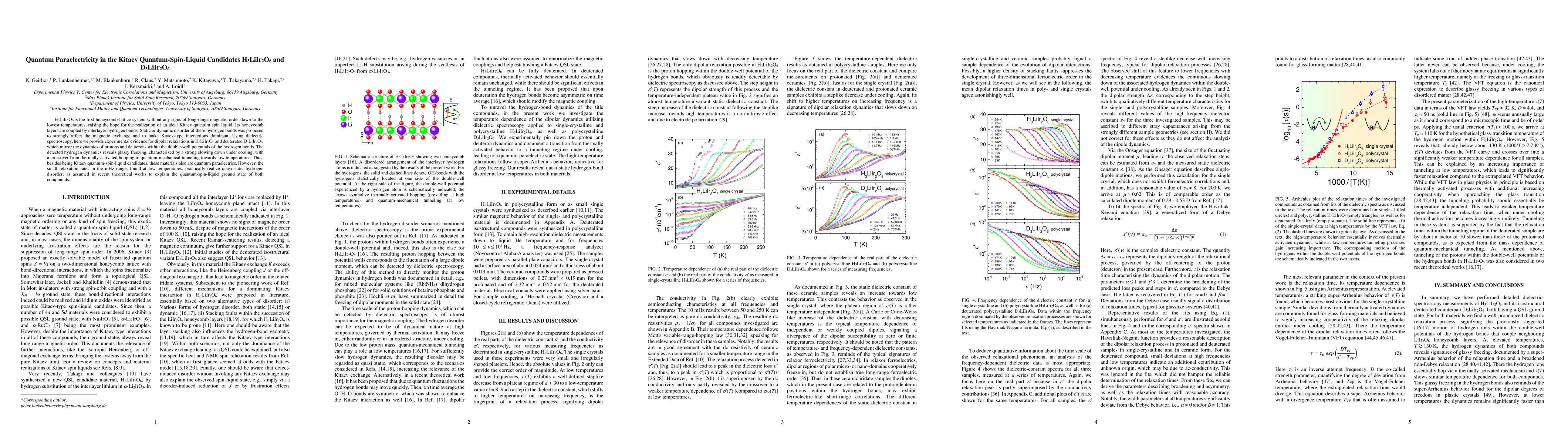 H3LiIr2O6 is the first honeycomb-lattice system without any signs of long-range magnetic order down to the lowest temperatures, raising the hope for the realization of an ideal Kitaev quantum spin liquid. Its honeycomb layers are coupled by interlayer hydrogen bonds. Static or dynamic disorder of these hydrogen bonds was proposed to strongly affect the magnetic exchange and to make Kitaev-type interactions dominant. Using dielectric spectroscopy, here we provide experimental evidence for dipolar relaxations in H3LiIr2O6 and deuterated D3LiIr2O6, which mirror the dynamics of protons and deuterons within the double-well potentials of the hydrogen bonds. The detected hydrogen dynamics reveals glassy freezing, characterized by a strong slowing down under cooling, with a crossover from thermally-activated hopping to quantum-mechanical tunneling towards low temperatures. Thus, besides being Kitaev quantum-spin-liquid candidates, these materials also are quantum paraelectrics. However, the small relaxation rates in the mHz range, found at low temperatures, practically realize quasi-static hydrogen disorder, as assumed in recent theoretical works to explain the quantum-spin-liquid ground state of both compounds.