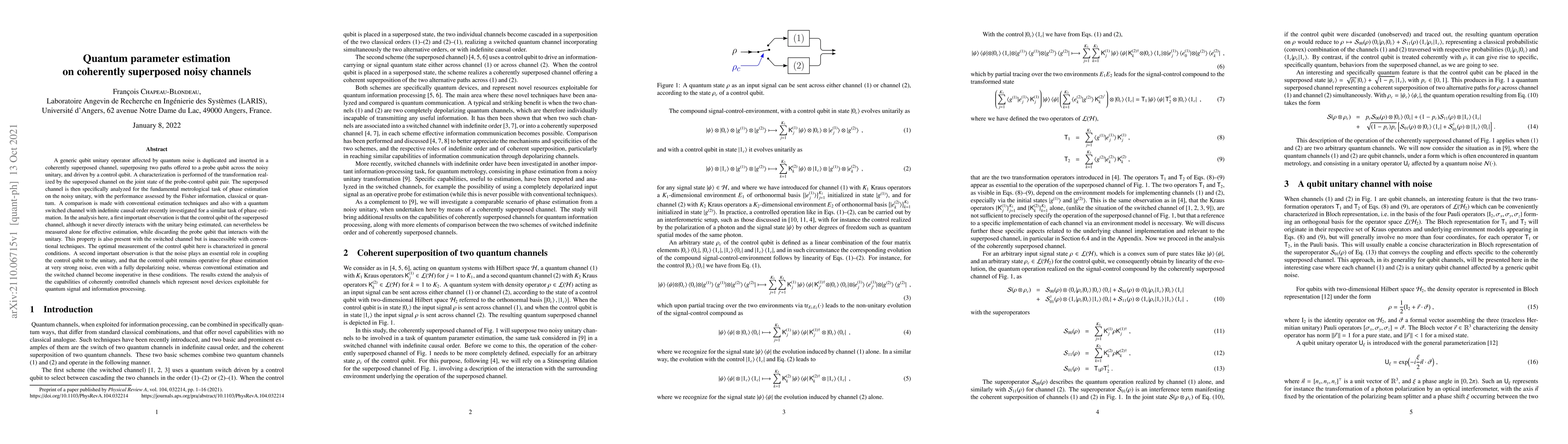 A generic qubit unitary operator affected by quantum noise is duplicated and inserted in a coherently superposed channel, superposing two paths offered to a probe qubit across the noisy unitary, and driven by a control qubit. A characterization is performed of the transformation realized by the superposed channel on the joint state of the probe-control qubit pair. The superposed channel is then specifically analyzed for the fundamental metrological task of phase estimation on the noisy unitary, with the performance assessed by the Fisher information, classical or quantum. A comparison is made with conventional estimation techniques and also with a quantum switched channel with indefinite causal order recently investigated for a similar task of phase estimation. In the analysis here, a first important observation is that the control qubit of the superposed channel, although it never directly interacts with the unitary being estimated, can nevertheless be measured alone for effective estimation, while discarding the probe qubit that interacts with the unitary. This property is also present with the switched channel but is inaccessible with conventional techniques. The optimal measurement of the control qubit here is characterized in general conditions. A second important observation is that the noise plays an essential role in coupling the control qubit to the unitary, and that the control qubit remains operative for phase estimation at very strong noise, even with a fully depolarizing noise, whereas conventional estimation and the switched channel become inoperative in these conditions. The results extend the analysis of the capabilities of coherently controlled channels which represent novel devices exploitable for quantum signal and information processing.