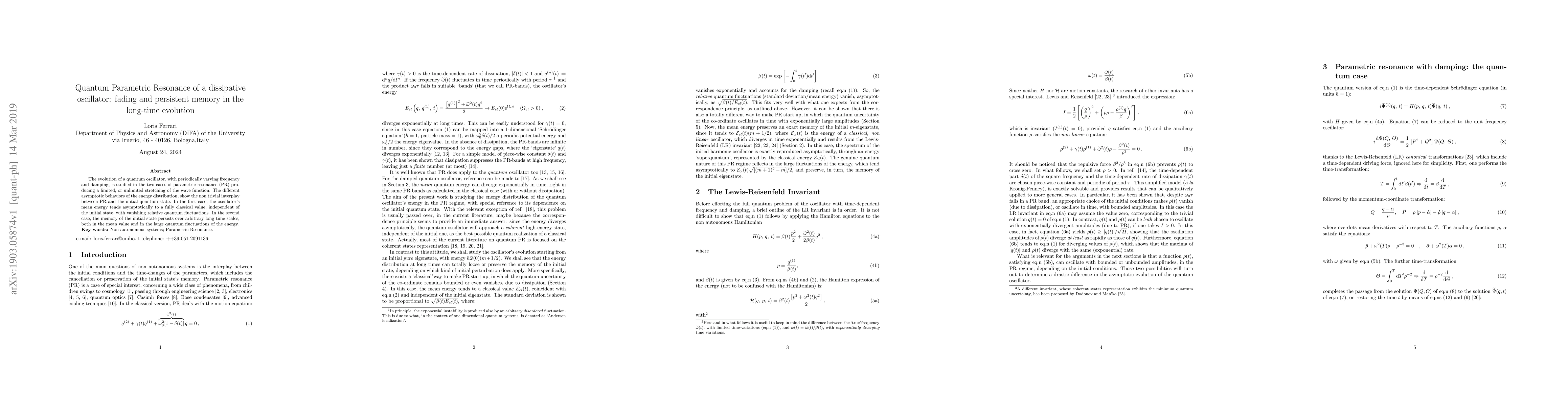 The evolution of a quantum oscillator, with periodically varying frequency and damping, is studied in the two cases of parametric resonance (PR) producing a limited, or unlimited stretching of the wave function. The different asymptotic behaviors of the energy distribution, show the non trivial interplay between PR and the initial quantum state. In the first case, the oscillator's mean energy tends asymptotically to a fully classical value, independent of the initial state, with vanishing relative quantum fluctuations. In the second case, the memory of the initial state persists over arbitrary long time scales, both in the mean value and in the large quantum fluctuations of the energy.