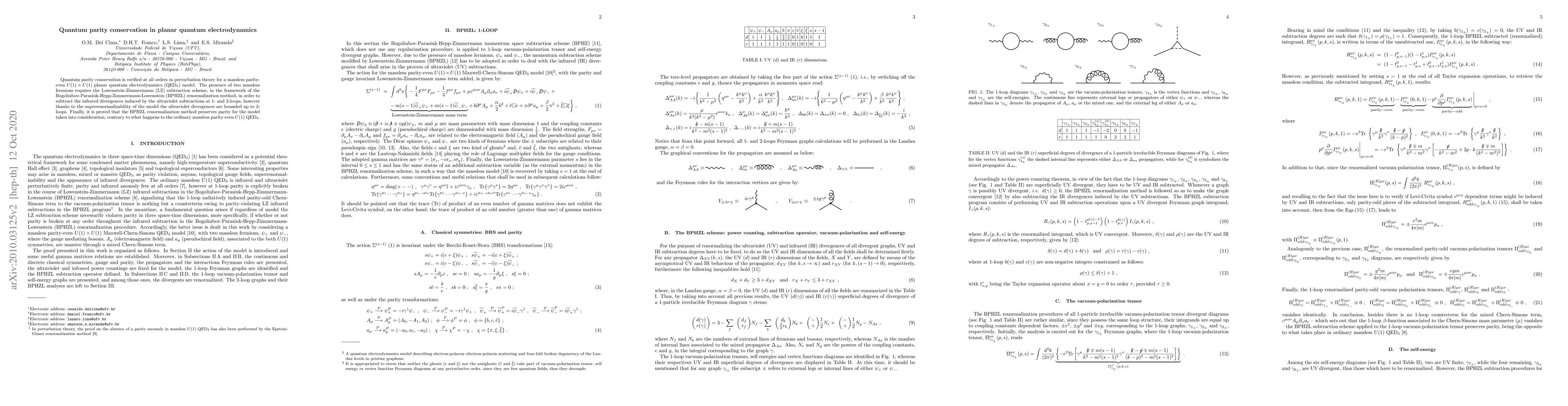 This paper verifies quantum parity conservation in a massless $U(1)\times U(1)$ planar QED$_3$ model using the BPHZL renormalization method, demonstrating that it preserves parity at all orders, unlike ordinary massless $U(1)$ QED$_3$. The model's superrenormalizability ensures bounded ultraviolet divergences up to 2-loops.