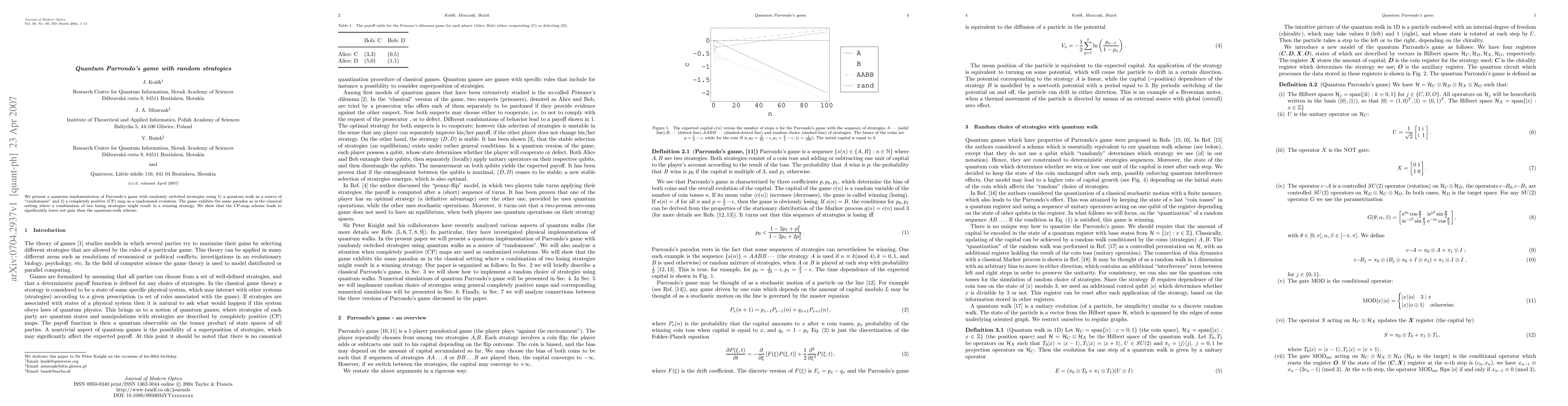 We present a quantum implementation of Parrondo's game with randomly switched strategies using 1) a quantum walk as a source of ``randomness'' and 2) a completely positive (CP) map as a randomized evolution. The game exhibits the same paradox as in the classical setting where a combination of two losing strategies might result in a winning strategy. We show that the CP-map scheme leads to significantly lower net gain than the quantum walk scheme.