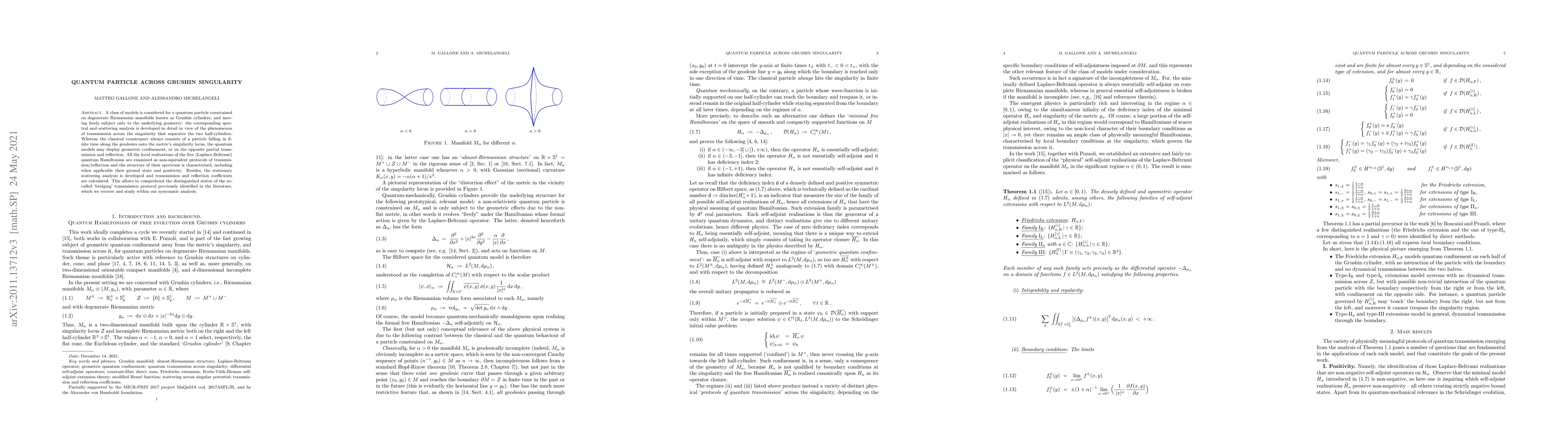 A class of models is considered for a quantum particle constrained on degenerate Riemannian manifolds known as Grushin cylinders, and moving freely subject only to the underlying geometry: the corresponding spectral analysis is developed in detail in view of the phenomenon of transmission across the singularity that separates the two half-cylinders. Whereas the classical counterpart always consists of a particle falling in finite time along the geodesics onto the metric's singularity locus, the quantum models may display geometric confinement, or on the opposite partial transmission and reflection. All the local realisations of the free (Laplace-Beltrami) quantum Hamiltonian are examined as non-equivalent protocols of transmission/reflection and the structure of their spectrum is characterised, including when applicable their ground state and positivity. Besides, the stationary scattering analysis is developed and transmission and reflection coefficients are calculated. This allows to comprehend the distinguished status of the so-called `bridging' transmission protocol previously identified in the literature, which we recover and study within our systematic analysis.
