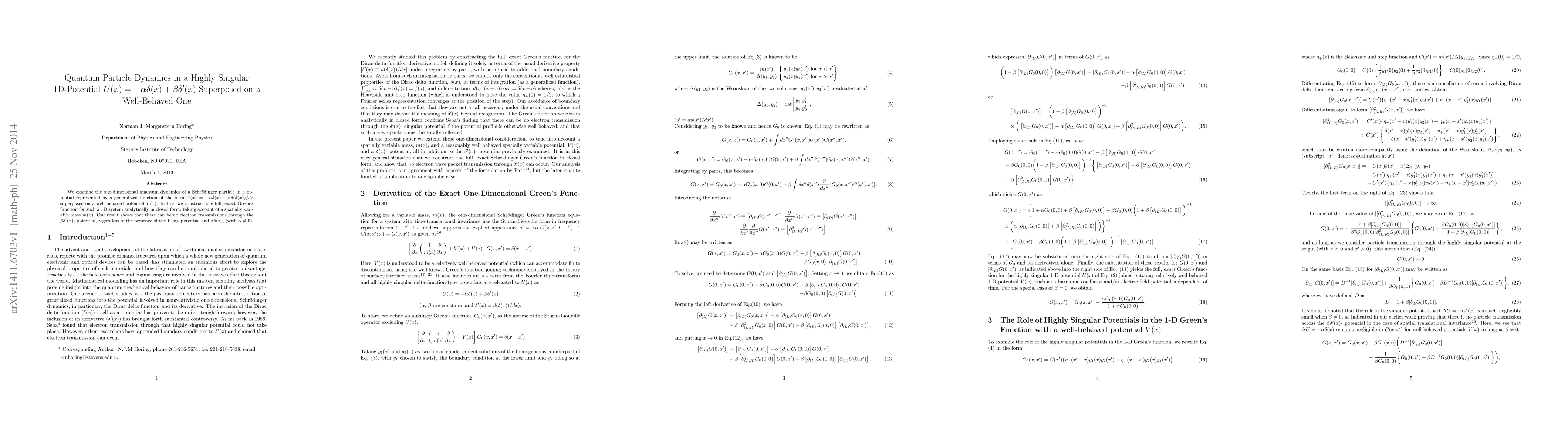 We examine the one-dimensional quantum dynamics of a Schroedinger particle in a potential represented by a generalized function of the form $U(x) = -\alpha \delta (x) + \beta d(\delta (x))/dx$ superposed on a well behaved potential $V(x)$. In this, we construct the full, exact Green's function for such a 1D system analytically in closed form, taking account of a spatially variable mass $m(x)$. Our result shows that there can be no electron transmission through the $\beta \delta '(x)$- potential, regardless of the presence of the $V(x)$- potential and $\alpha \delta (x)$, (with $\alpha \ne 0$).