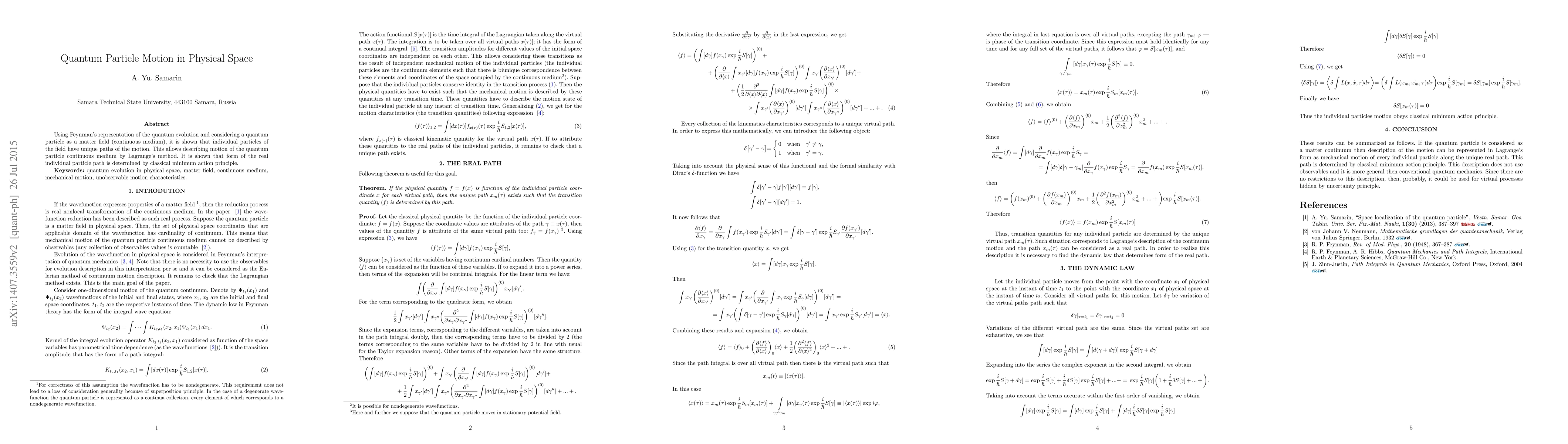 Using Feynman's representation of the quantum evolution and considering a quantum particle as a matter field (continuous medium), it is shown that individual particles of the field have unique paths of the motion. This allows describing motion of the quantum particle continuous medium by Lagrange's method. It is shown that form of the real individual particle path is determined by classical minimum action principle.