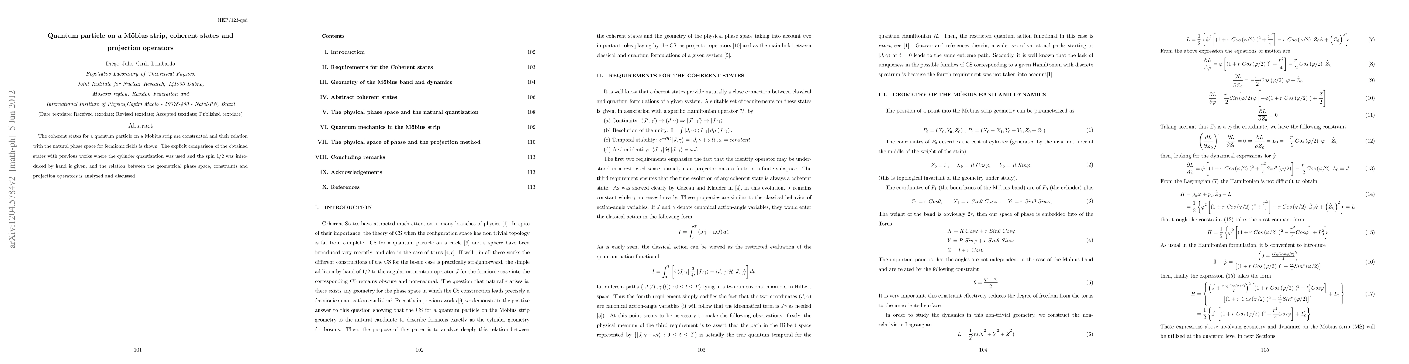 This paper constructs coherent states for a quantum particle on a Mobius strip, linking them to fermionic field phase space. It compares these states with previous cylinder quantization methods, highlighting differences and discussing the geometrical phase space, constraints, and projection operators.