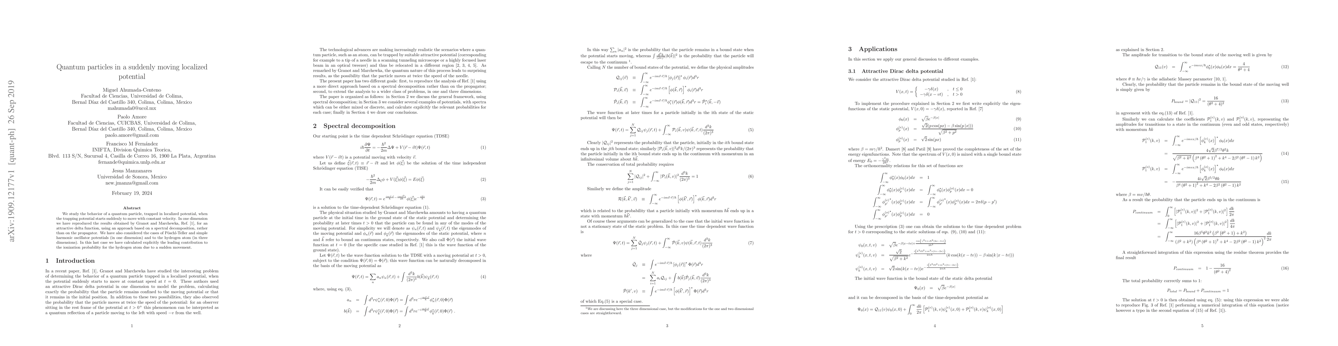 This paper investigates the dynamics of quantum particles in various localized potentials, including delta function, P\"oschl-Teller, harmonic oscillator, and hydrogen atom, when the potential begins to move suddenly. The study employs spectral decomposition to analyze the behavior, with a focus on the ionization probability for the hydrogen atom due to such a sudden movement.