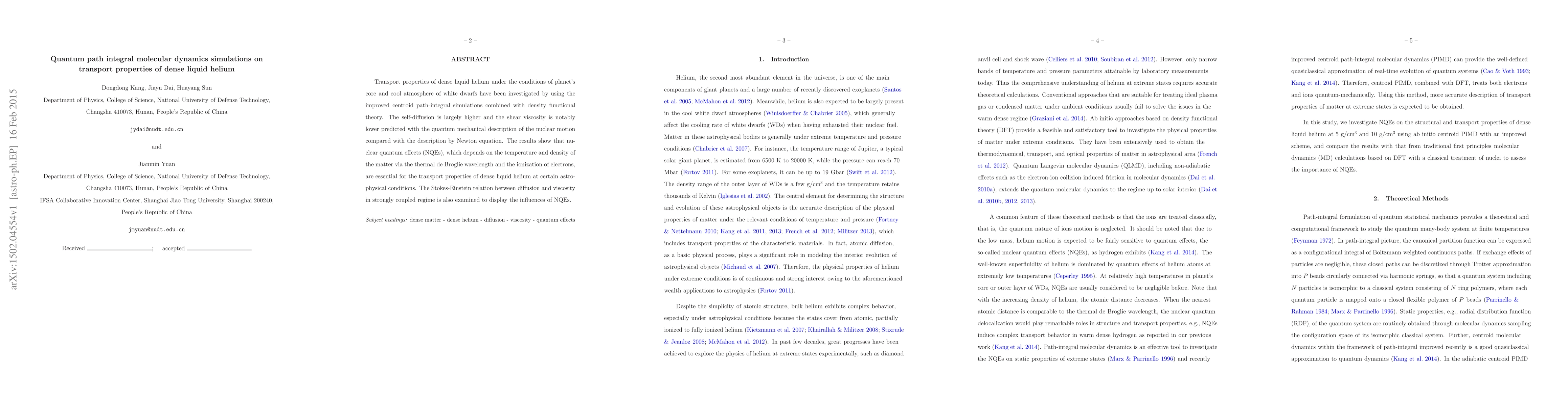 This study employs quantum path integral molecular dynamics simulations to investigate the transport properties of dense liquid helium, revealing that nuclear quantum effects significantly influence self-diffusion and shear viscosity under astrophysical conditions. The findings underscore the importance of quantum mechanical descriptions over classical Newtonian models for understanding these properties.