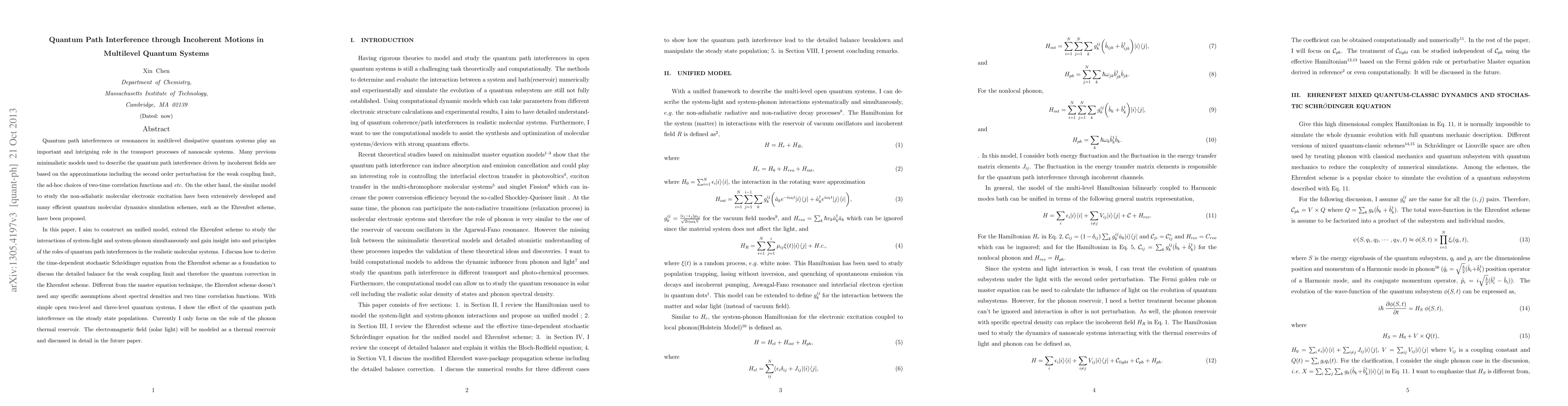 Quantum path interferences or resonances in multilevel dissipative quantum systems play an important and intriguing role in the transport processes of nanoscale systems. Many previous minimalistic models used to describe the quantum path interference driven by incoherent fields are based on the approximations including the second order perturbation for the weak coupling limit, the ad-hoc choices of two-time correlation functions and $\it{etc}$. On the other hand, the similar model to study the non-adiabatic molecular electronic excitation have been extensively developed and many efficient quantum molecular dynamics simulation schemes, such as the Ehrenfest scheme, have been proposed. In this paper, I aim to propose an unified model, extend the Ehrenfest scheme to study the interactions of system-light and system-phonon simultaneously and gain insight into and principles of the roles of quantum path interferences in the realistic molecular systems. I discuss how to derive the time-dependent stochastic Schr$\ddot{o}$dinger equation from the Ehrenfest scheme as a foundation to discuss the detailed balance for the weak coupling limit and therefore the quantum correction in the Ehrenfest scheme. Different from the master equation technique, the Ehrenfest scheme doesn't need any specific assumptions about spectral densities and two time correlation functions. With simple open two-level and three-level quantum systems, I show the effect of the quantum path interference on the steady state populations. Currently I only focus on the role of the phonon thermal reservoir. The electromagnetic field (solar light) will be modeled as a thermal reservoir and discussed in detail in the future paper.