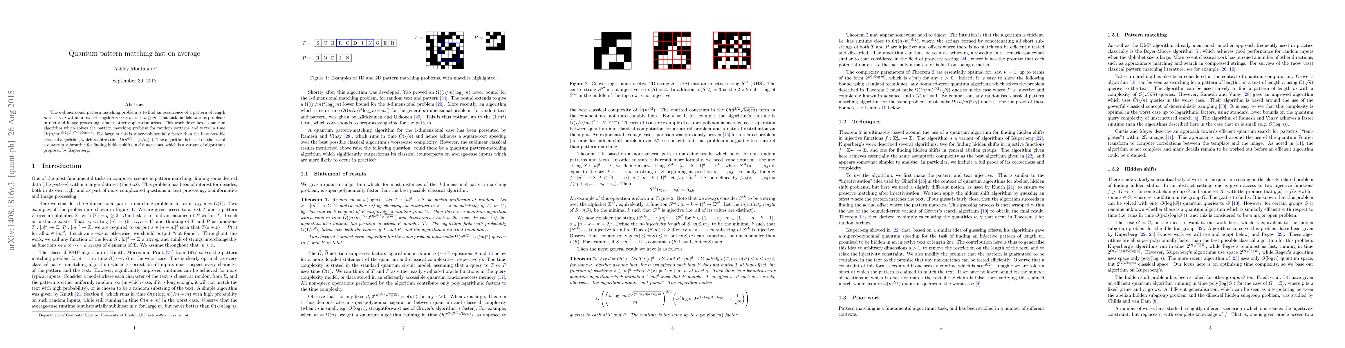 This paper presents a quantum algorithm that solves the $d$-dimensional pattern matching problem faster on average than the best classical algorithms, achieving a time complexity of $\widetilde{O}((n/m)^{d/2} 2^{O(d^{3/2}\sqrt{\log m})})$, significantly outperforming classical $\widetilde{\Omega}( (n/m)^d + n^{d/2} )$ for large $m$. The quantum approach leverages a subroutine for detecting hidden shifts in $d$ dimensions.