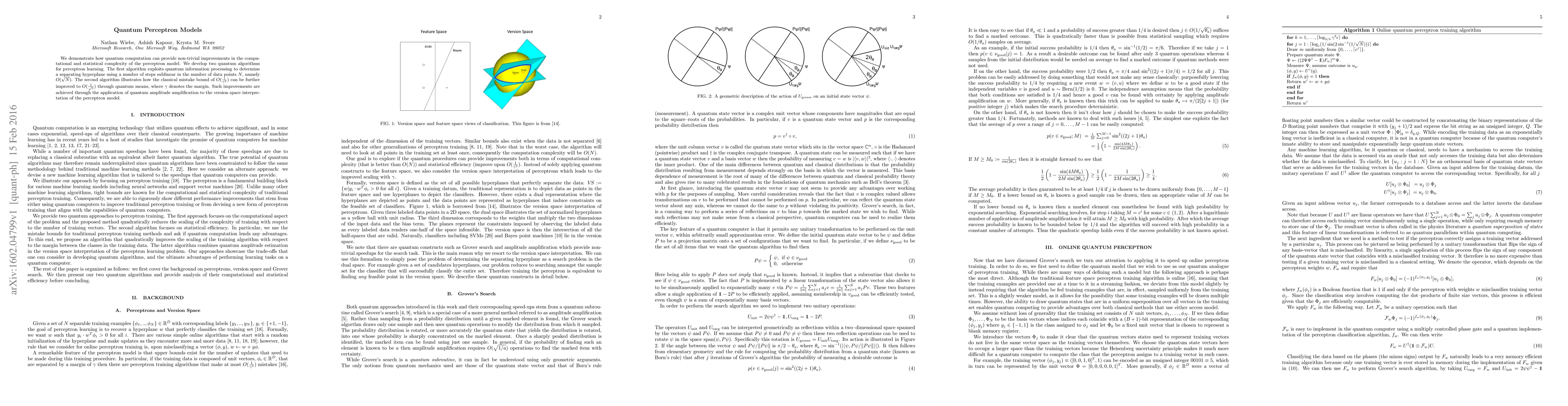 We demonstrate how quantum computation can provide non-trivial improvements in the computational and statistical complexity of the perceptron model. We develop two quantum algorithms for perceptron learning. The first algorithm exploits quantum information processing to determine a separating hyperplane using a number of steps sublinear in the number of data points $N$, namely $O(\sqrt{N})$. The second algorithm illustrates how the classical mistake bound of $O(\frac{1}{\gamma^2})$ can be further improved to $O(\frac{1}{\sqrt{\gamma}})$ through quantum means, where $\gamma$ denotes the margin. Such improvements are achieved through the application of quantum amplitude amplification to the version space interpretation of the perceptron model.